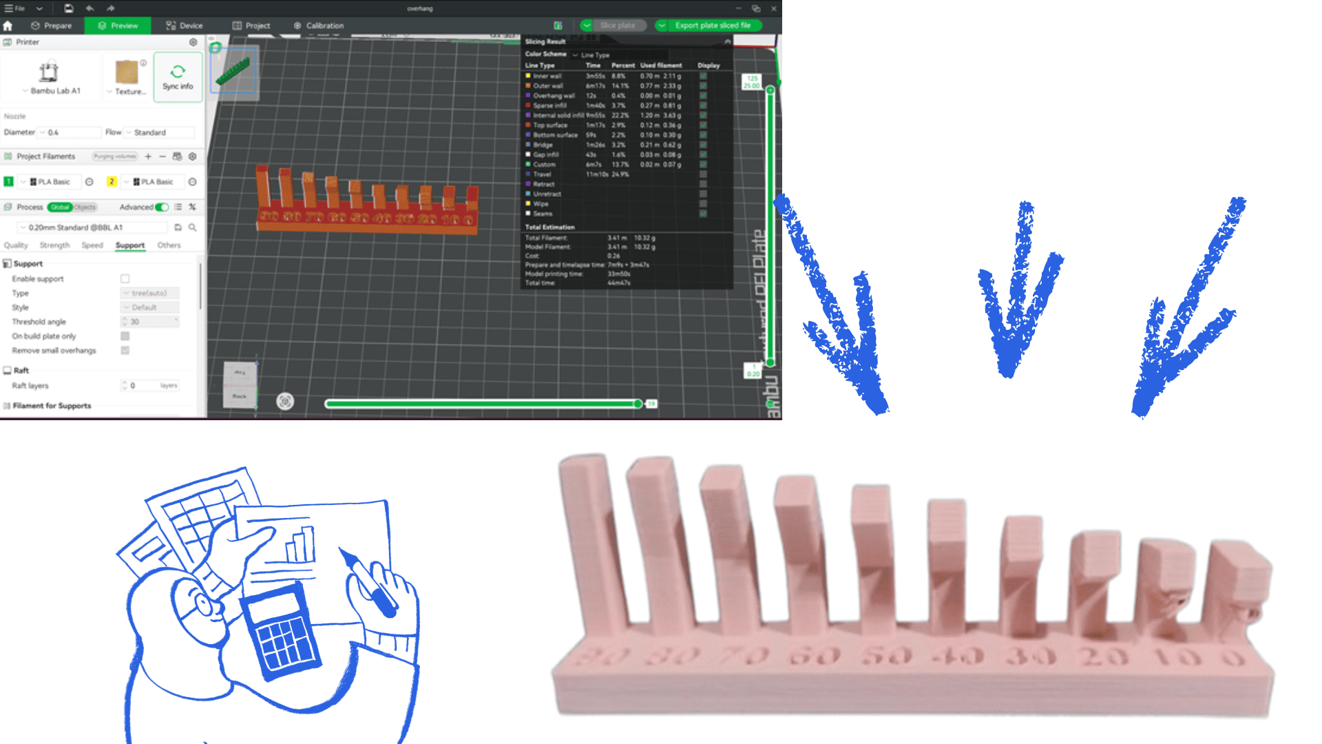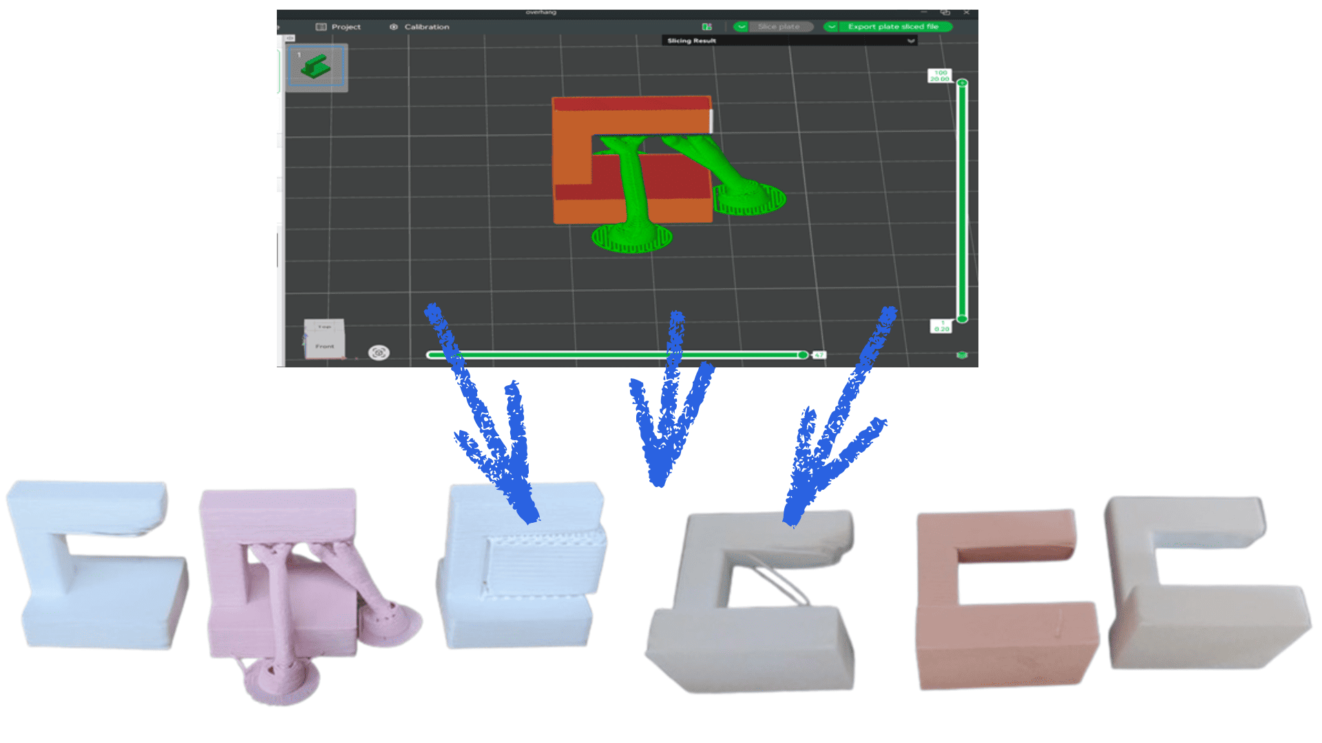 - David: Overhang testing (normal vs tree supports) and clearance evaluation.