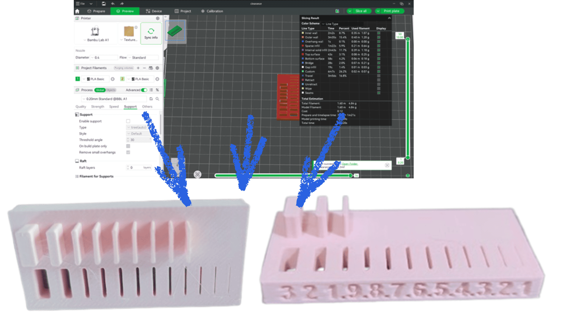 The testing process also highlighted the importance of correctly configuring parameters such as layer height, temperature, infill, and support type. Small variations in these parameters significantly affected the final outcome, especially in clearance and fit tests, where tolerances below certain thresholds resulted in fused or non-functional parts.