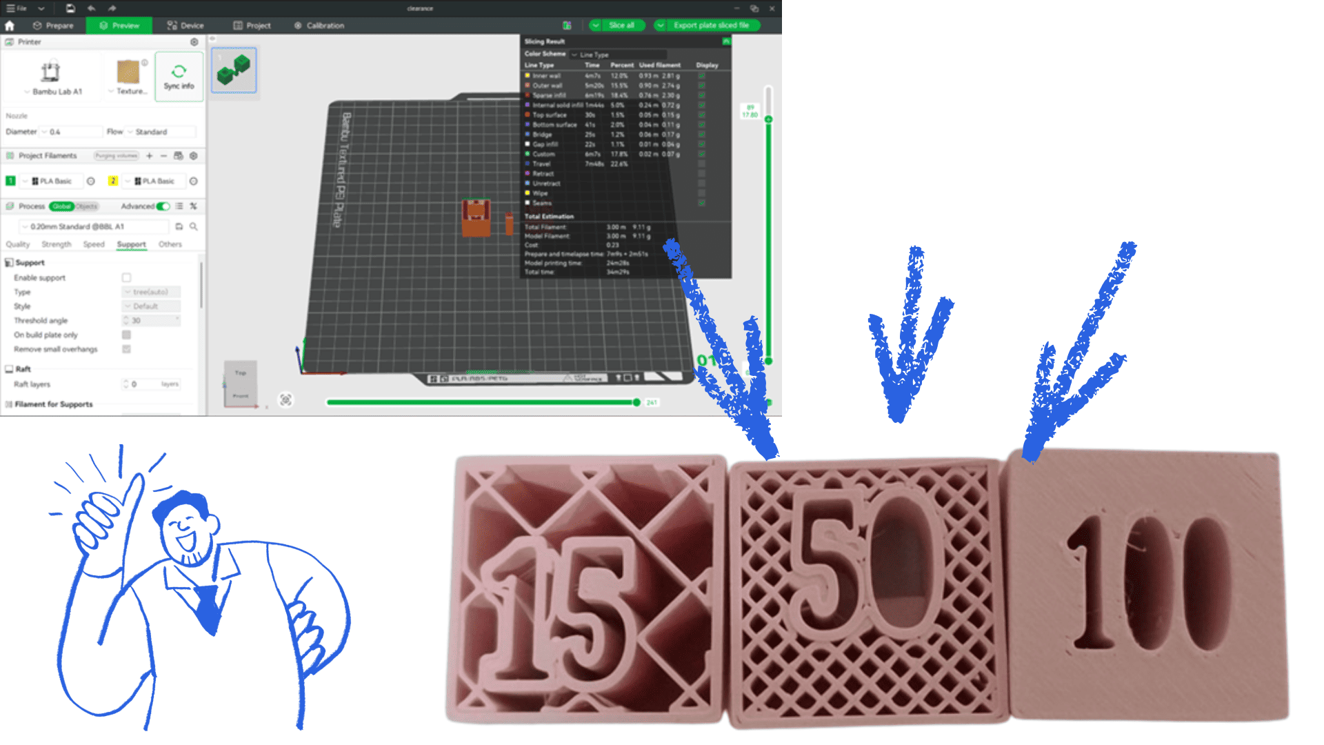Additionally, we observed that support strategies (standard vs. tree supports) have a direct impact on both material efficiency and surface finish. While supports improve structural stability during printing, they also introduce post-processing challenges that must be considered during the design phase.