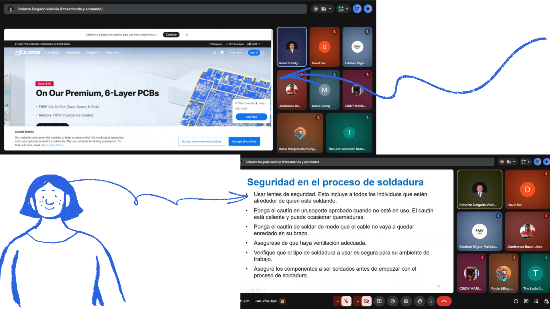 Professor Roberto Delgado conducted a virtual introduction to printed circuit boards (PCBs), covering materials and manufacturing methods. He also explained the soldering process, the materials and equipment used, and the necessary safety procedures for these activities.