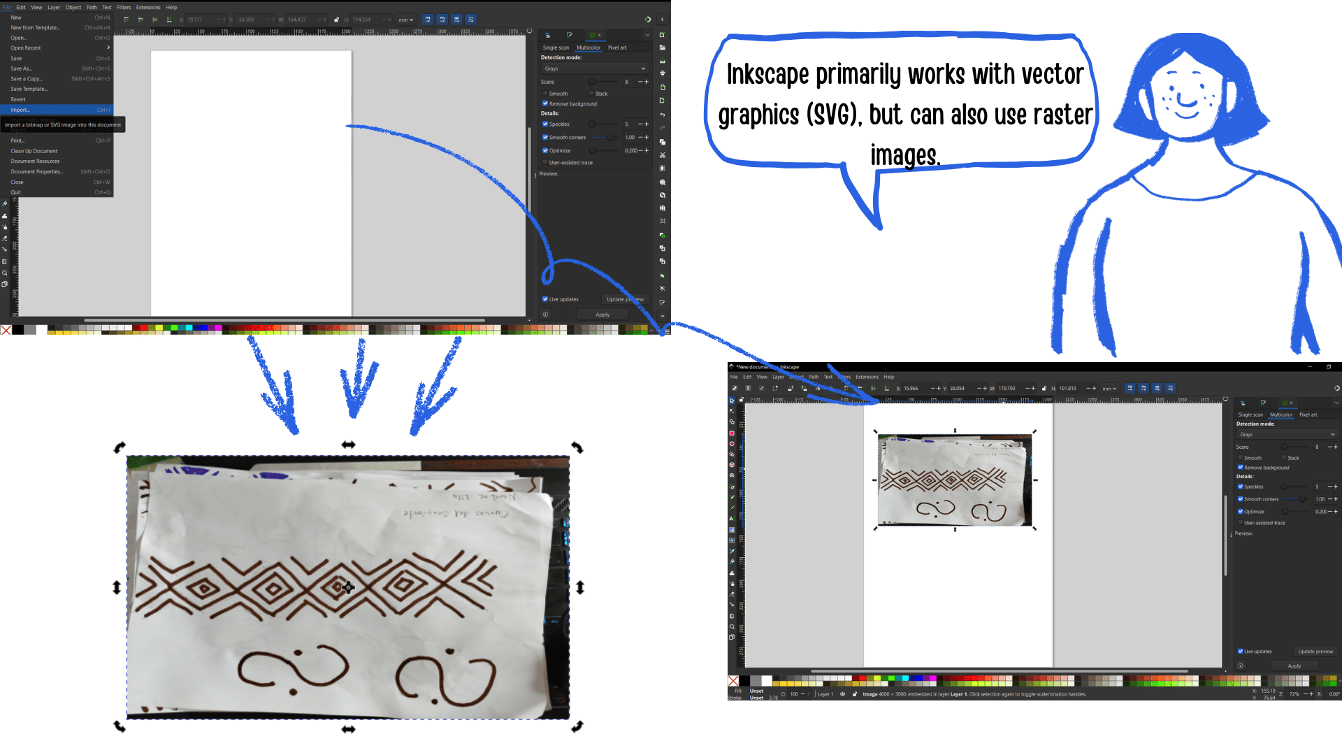 | Inkscape | Vector | ✔ Limited; can import raster images and embed them | ✔ Fully supported; create shapes, paths, layers, scalable designs | Logo design, illustrations, SVG graphics, print or web vectors |