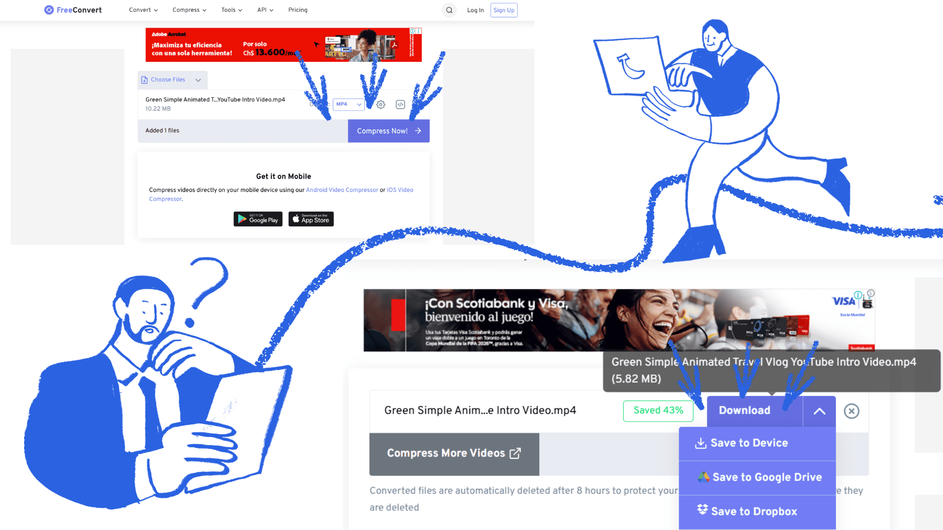 To compress a video, first open your web browser and type something like "compress video online" into the search bar. Then select one of the websites that appears in the search results. On the site, click "Select file" or "Upload video," which will allow you to locate the video on your computer. Once you've chosen the file, the platform will compress it automatically or by pressing the compress button. Finally, download the compressed video to your computer.