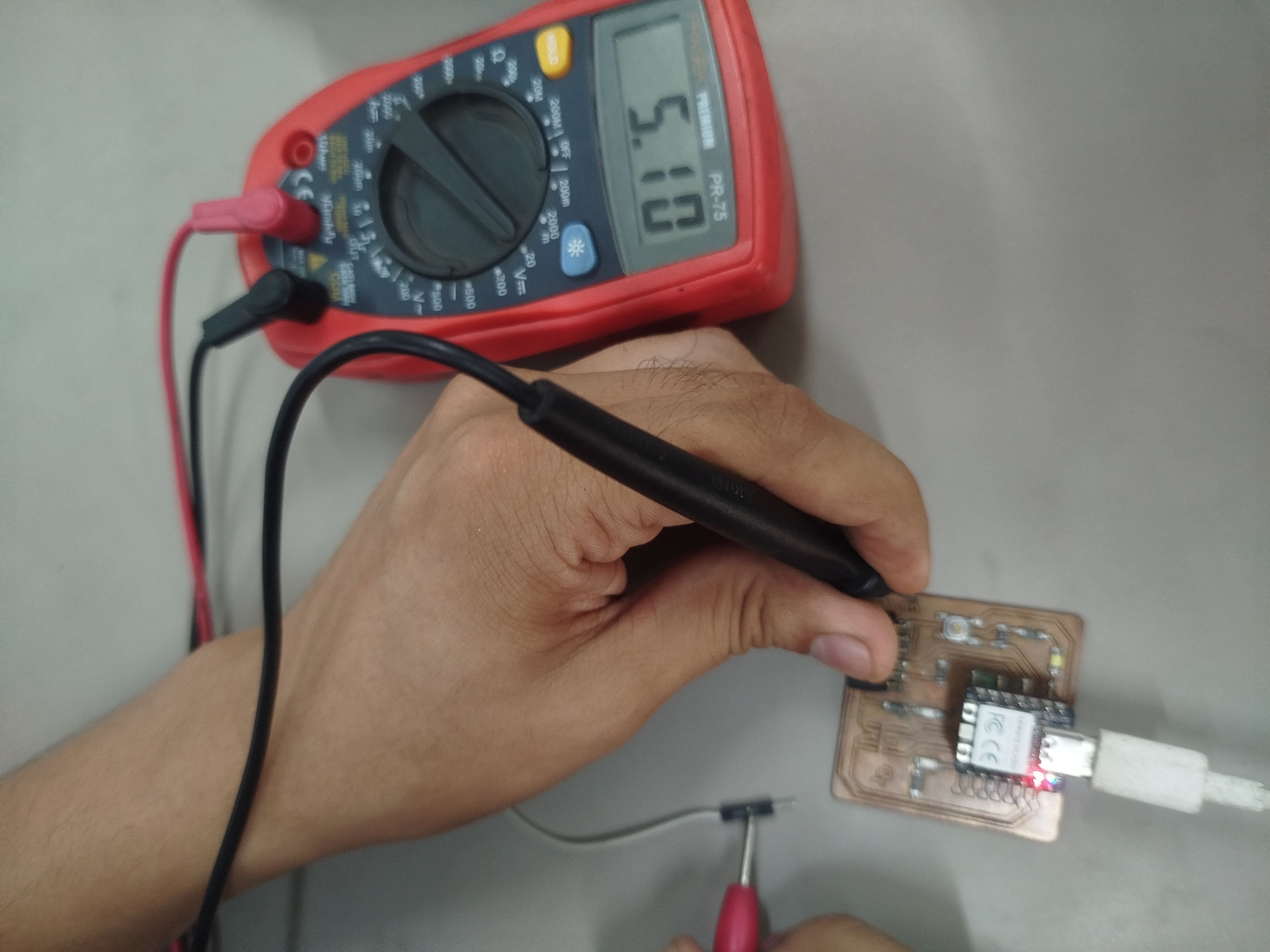 To verify the output voltages, we used a jumper wire and moved the multimeter knob to DC 20V, the output voltage being 5V correctly designed on the board.