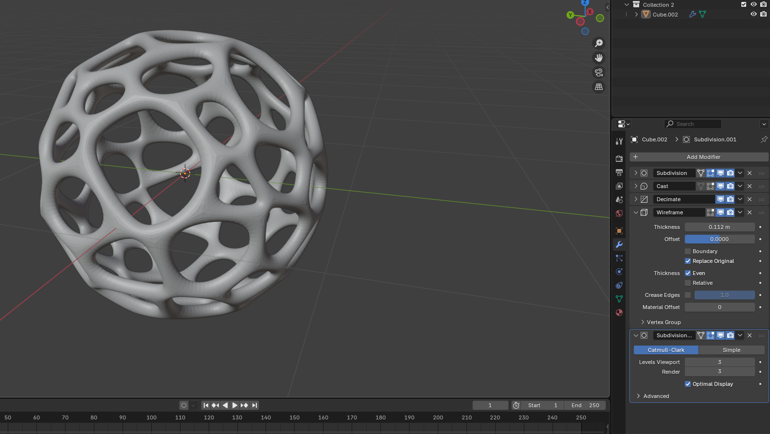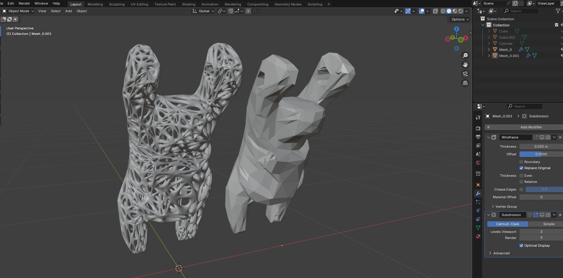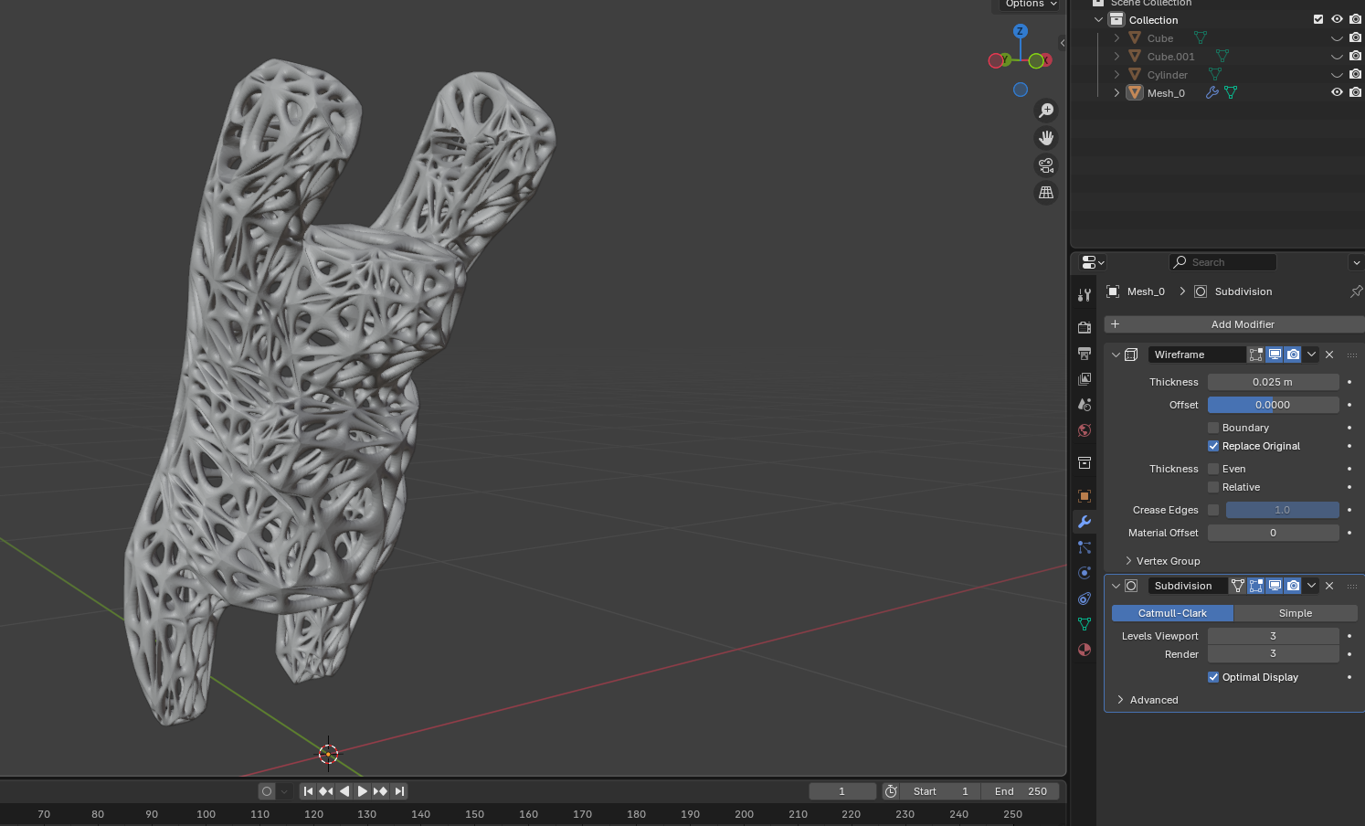 The koala scan was not merely reproduced; it became the starting point for a parametric transformation. Through the use of modifiers such as Decimate, Wireframe, and Subdivision Surface, the object transitioned from figurative representation to structural lattice.