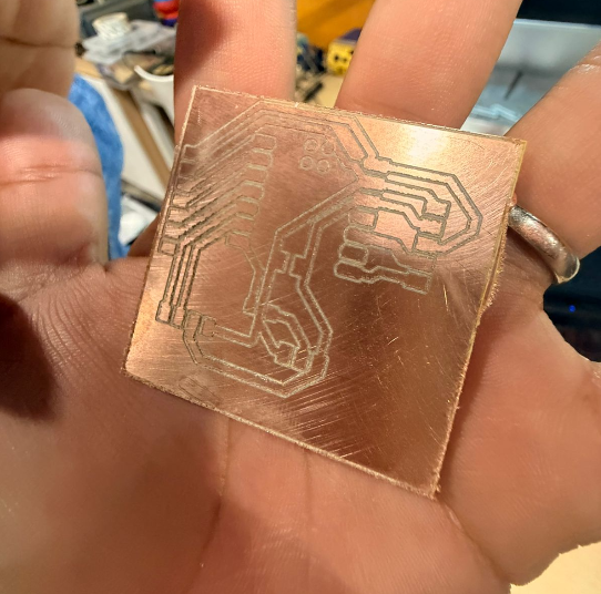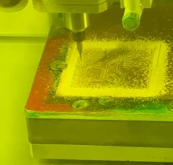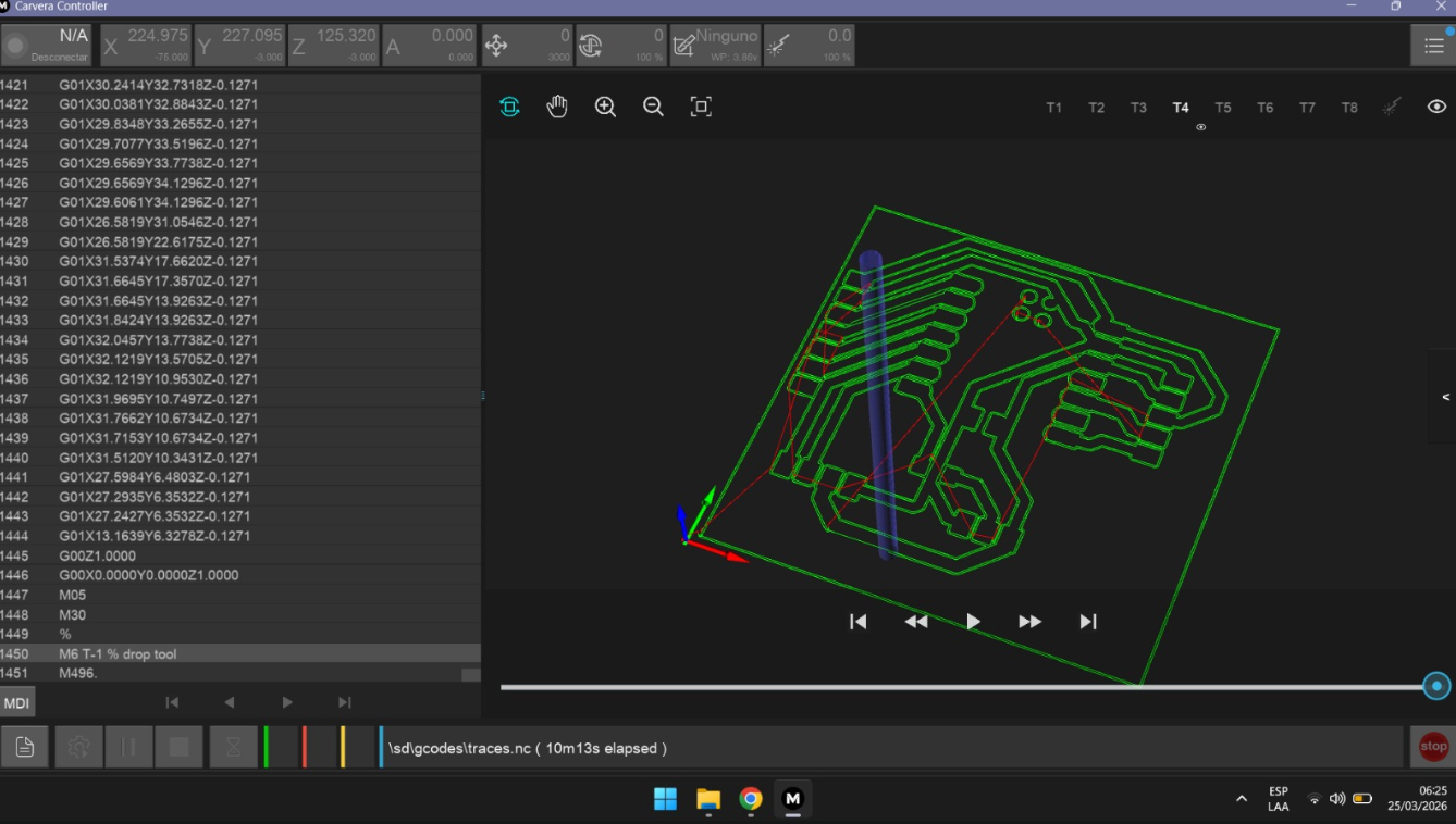Once calibration was complete, the machine began executing the toolpath for the traces using the T4 tool. The milling bit moved across the board, removing copper to define the circuit paths.