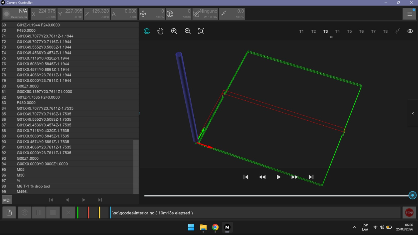 The software was connected to the machine via USB, and from the interface we were able to load the machining files, configure tools, and control the fabrication process.