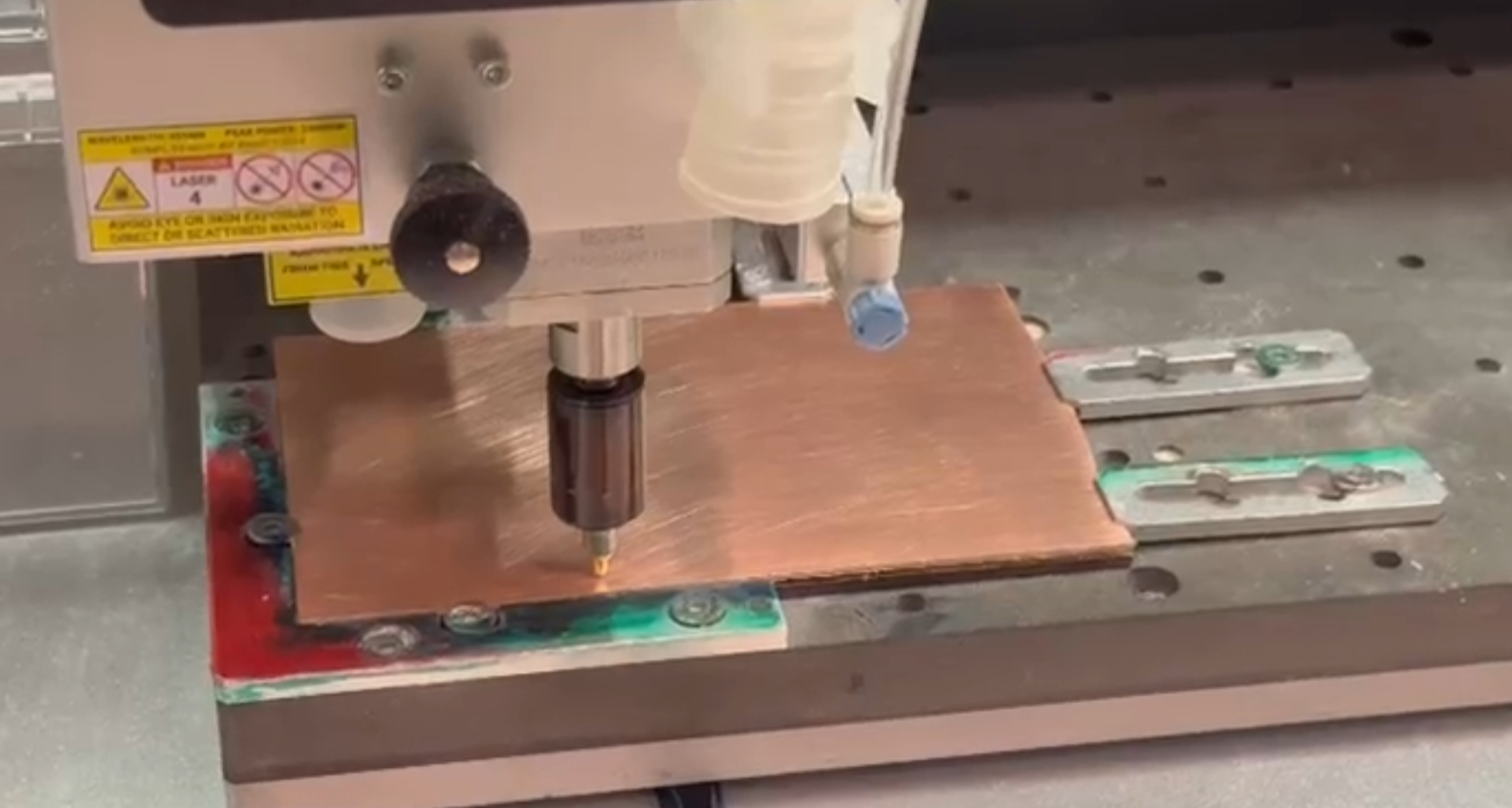 Before starting the machining process, the copper board (baquelita) had to be securely fixed to the machine bed. This was done using screws to prevent any movement during cutting.