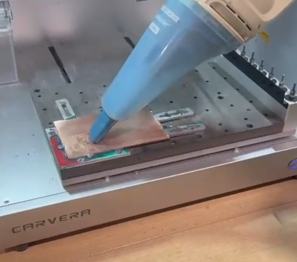 After the milling process was completed, we cleaned the surface using a vacuum to remove copper debris. Then, we manually cut the tabs using a small hand saw to release the PCB from the board.