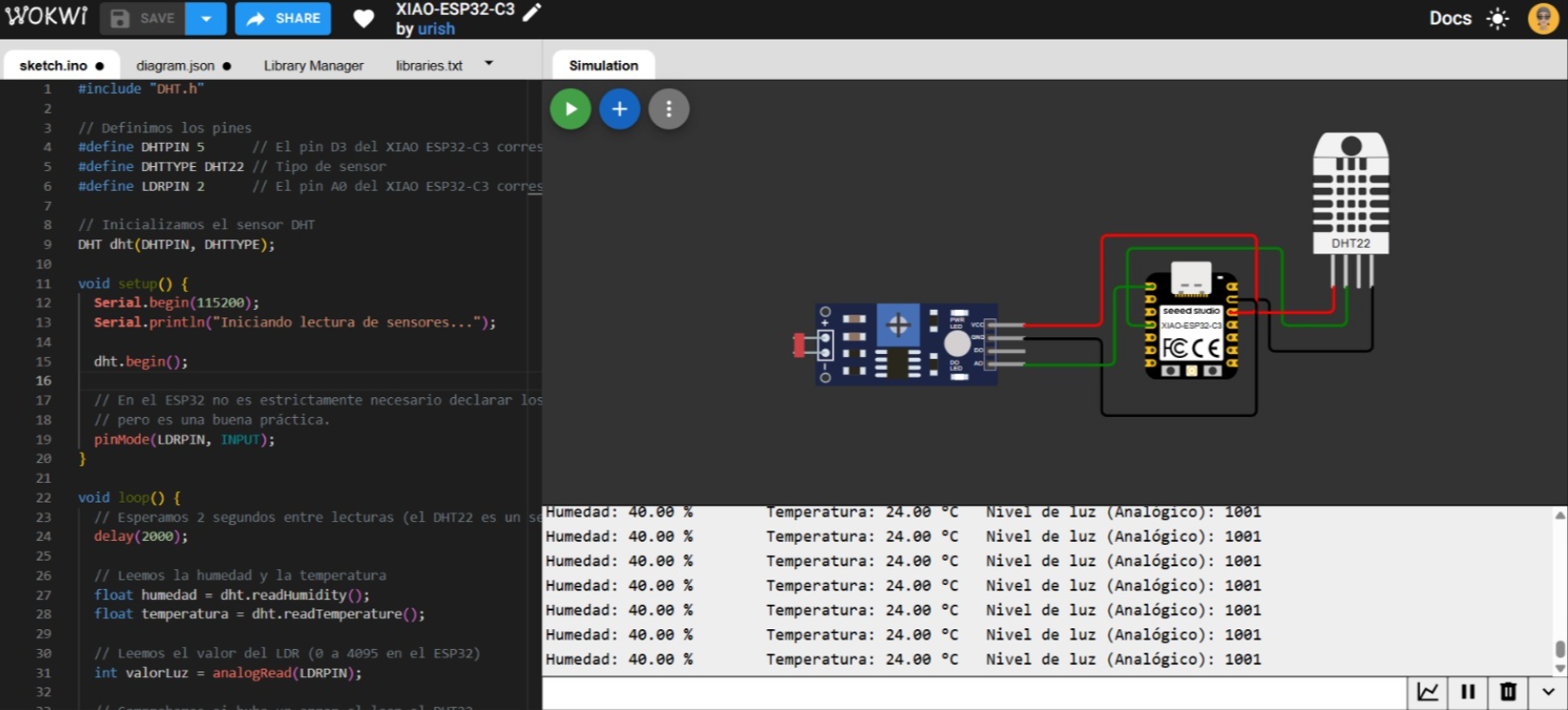 Using Wokwi, we created a digital simulation of the circuit, connecting the Xiao ESP32C3 microcontroller with both the light sensor (photoresistor) and the humidity and temperature sensor. This allowed us to verify the logic of the connections and test the initial code.