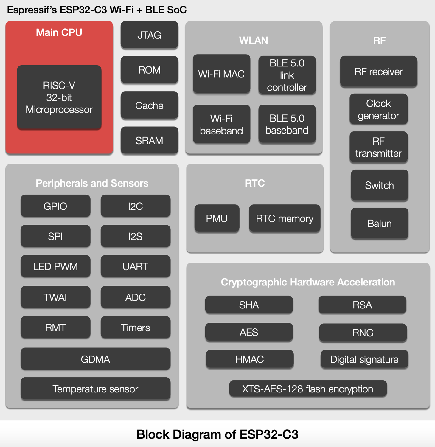 The microcontroller integrates several internal subsystems that support communication interfaces, peripheral control, and wireless connectivity.