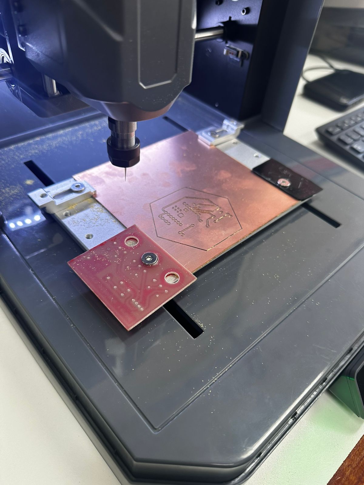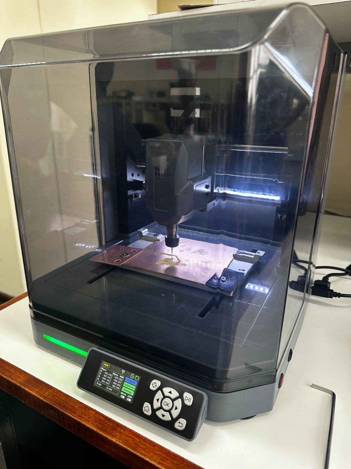 The circuit traces were produced using a Genmitsu CNC milling machine, which is commonly used for PCB prototyping in fabrication laboratories. This machine removes copper selectively from a copper-clad board in order to isolate the traces of the circuit.