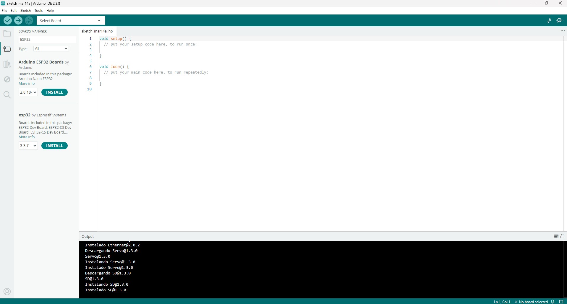 The first step was to install and configure the Arduino IDE. After that, the correct board definition for the XIAO ESP32-C3 was selected and the serial port assigned to the board was configured.