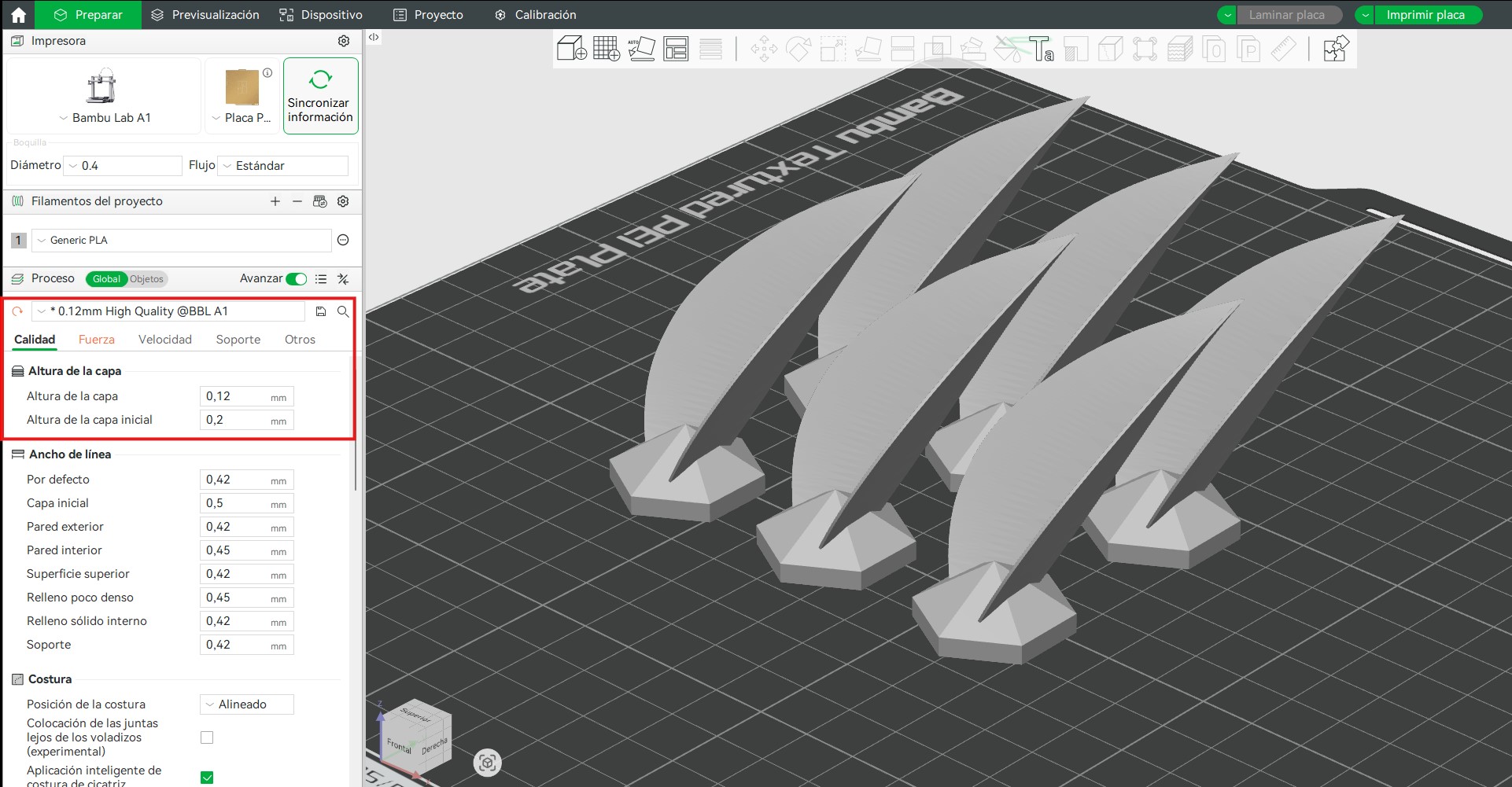 The selected layer height of 0.12 mm improved surface quality and the definition of the curves, which was especially important for the organic geometry of the petals.