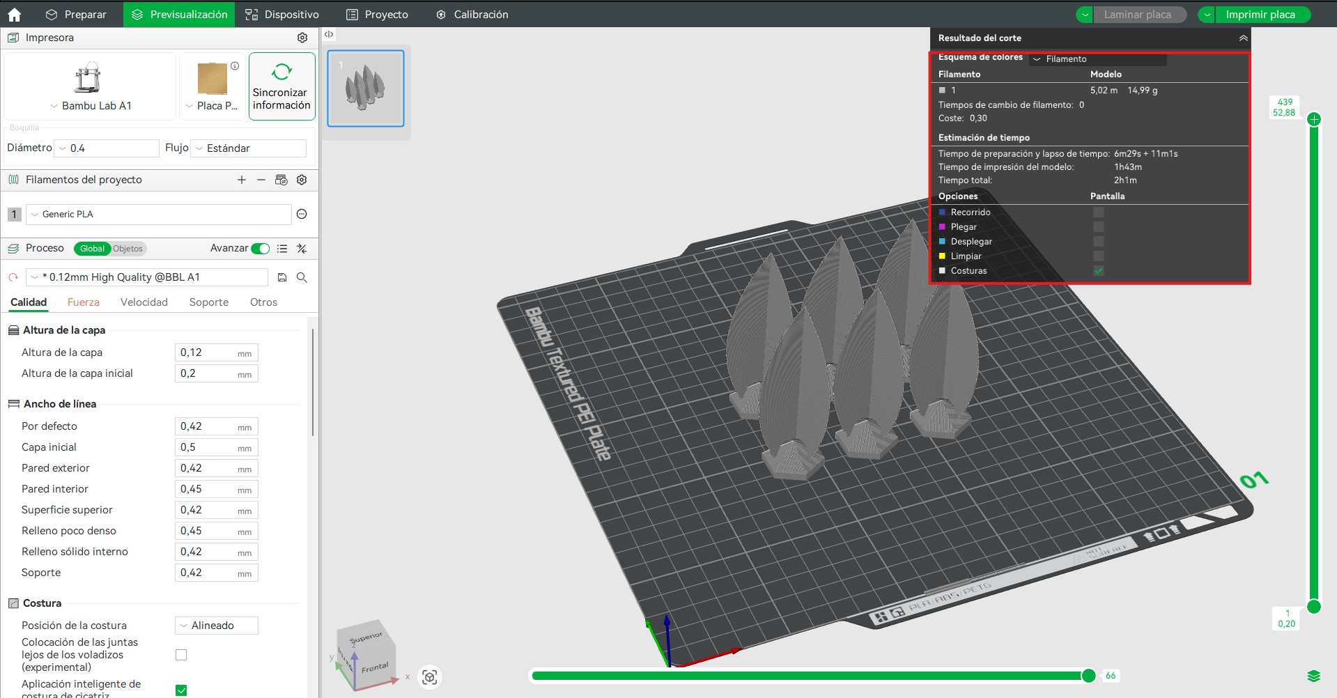 After validating the simulation, the file was prepared for printing. The generated G-code contained all the instructions needed by the printer, including movement, temperatures, speed, and extrusion control.