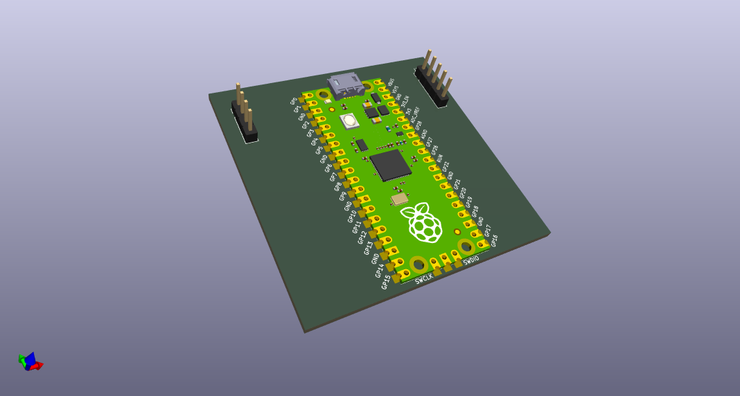 TThis image shows the schematic design created in KiCad using a Raspberry Pi Pico as the main microcontroller. Two pin headers were added to allow connections for GPIO signals, 3.3V power, and GND for external devices.