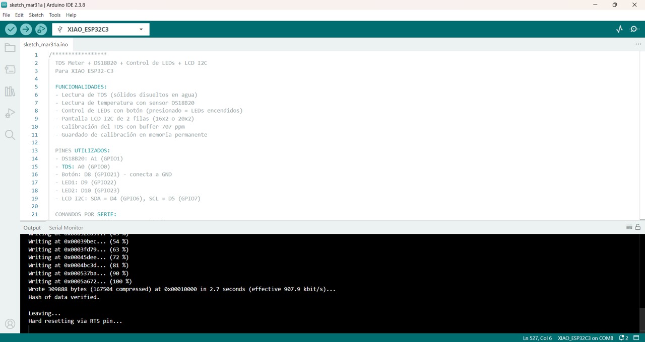 In this project, the LCD screen allowed the correct visualization of temperature and TDS values. For its operation, it was necessary to identify the I2C address through a scan (0x27), which made it possible to establish proper communication. In addition, the LiquidCrystal_I2C library was used, facilitating the programming and control of the display.