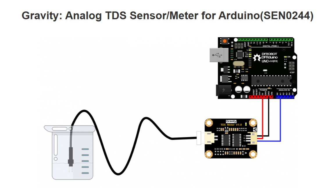 The sensor used is the Gravity TDS Meter V1.0, a device designed to measure the amount of total dissolved solids (TDS) in water. This type of sensor is widely used in applications such as water quality monitoring, hydroponic systems, aquariums, and environmental projects.
