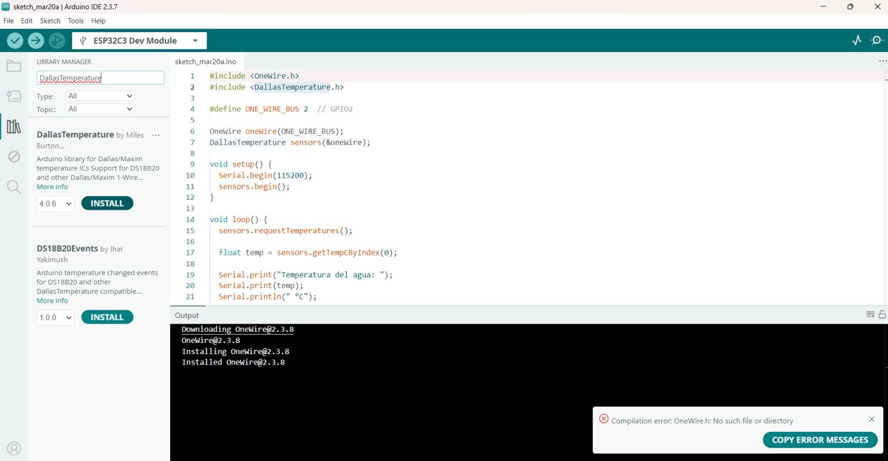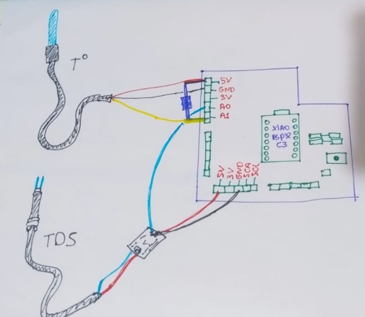 To make both sensors work, I used a code that a friend from Systems Engineering helped me correct. The program was developed for a XIAO ESP32-C3 board and integrates three main functions: reading the DS18B20 temperature sensor, reading the TDS sensor, and controlling two LEDs through a button.