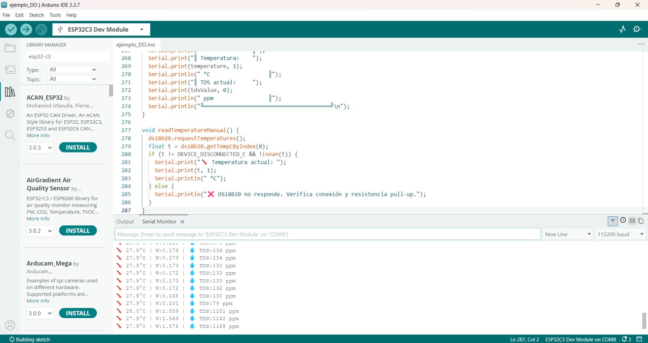 Another relevant aspect was understanding that the TDS sensor should not be interpreted in isolation, since its measurement depends on the water temperature. By integrating the DS18B20 within the same code, I was able to obtain thermal compensation and a more realistic TDS reading.
