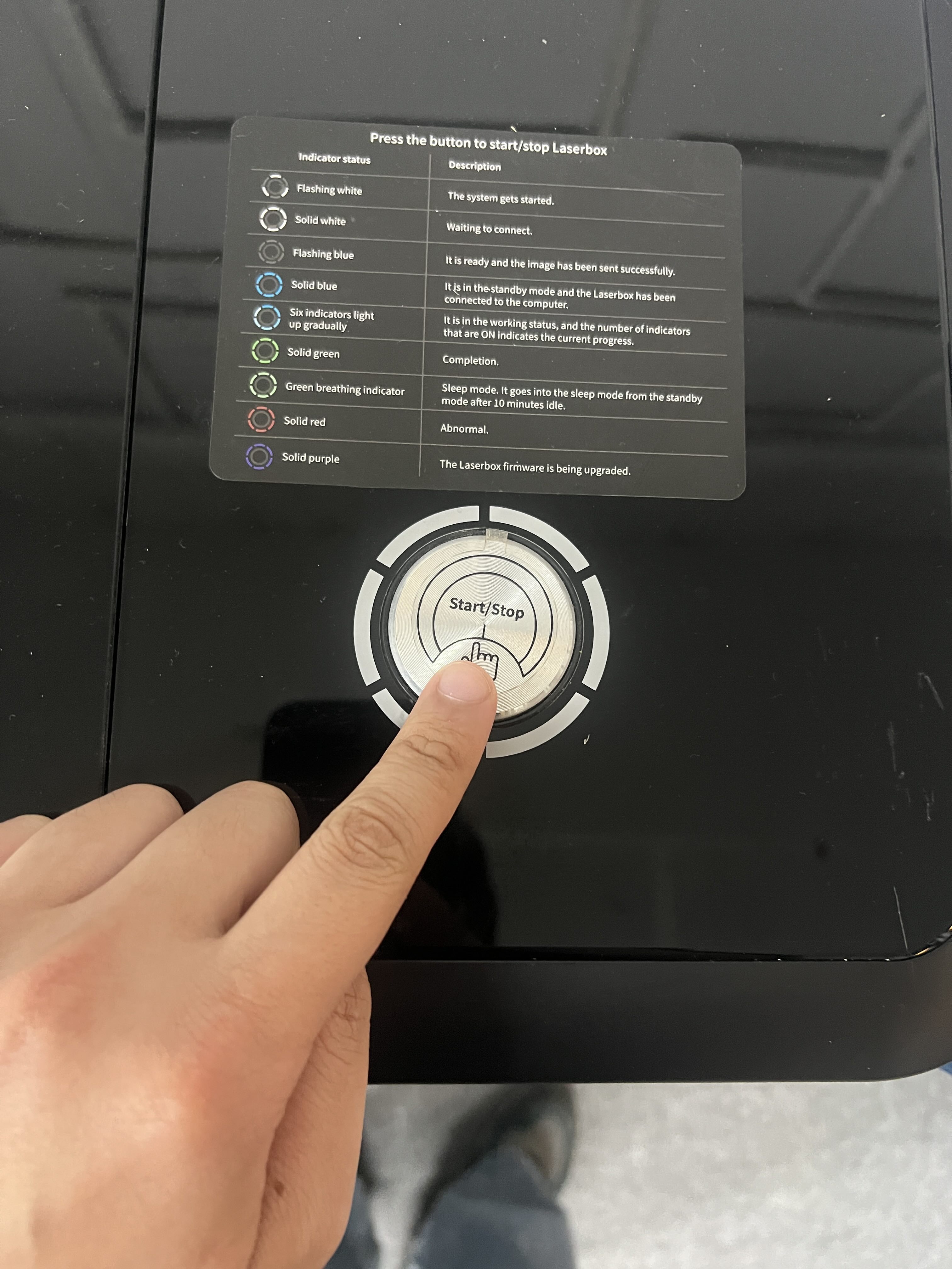 The Laserbox machine also has a start/stop button on the top panel. This button can be pressed to immediately pause or stop the machine if an abnormal situation occurs.
