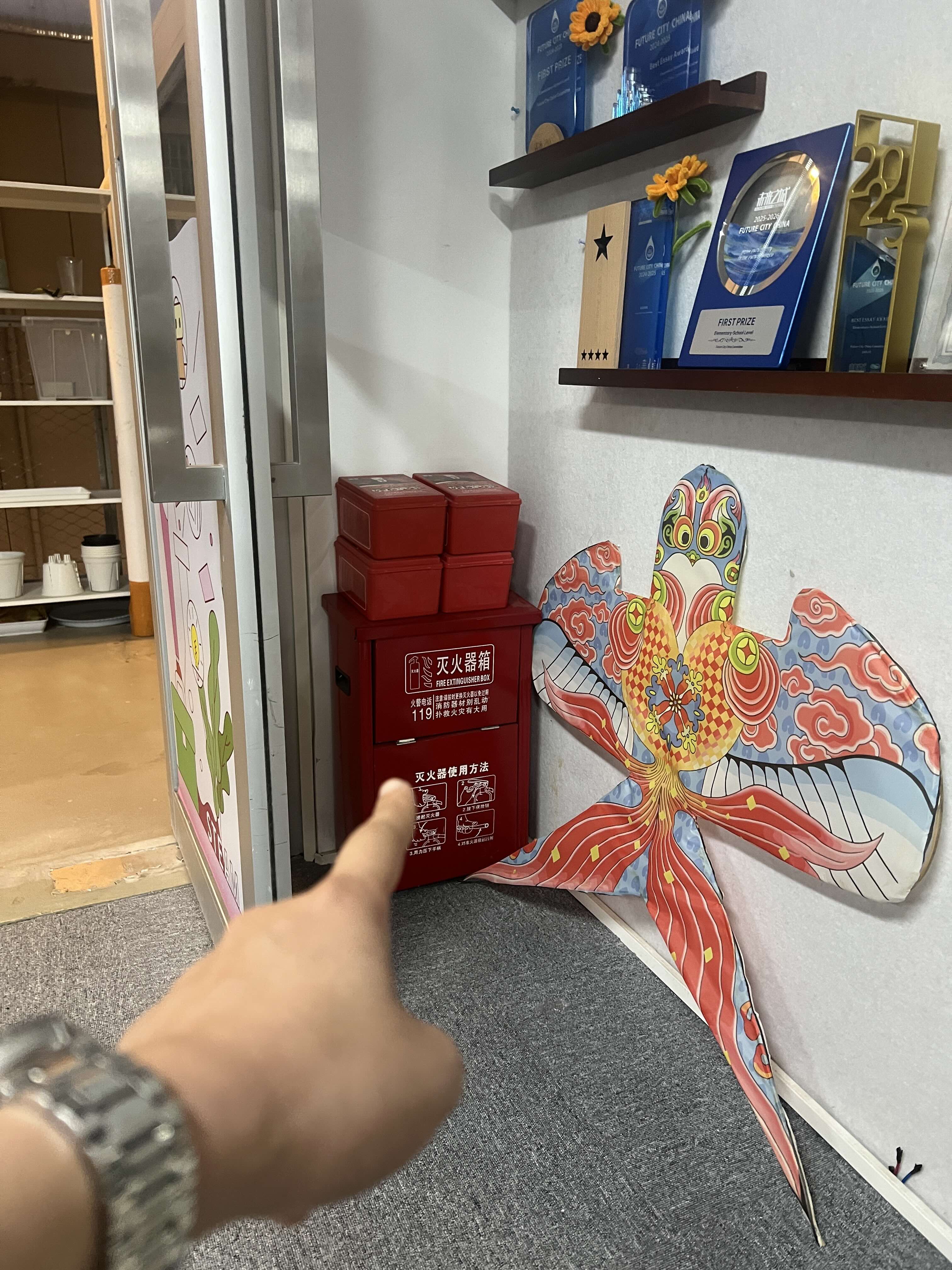 The laser cutter is placed next to a fire extinguisher so that a small fire can be handled immediately if necessary.