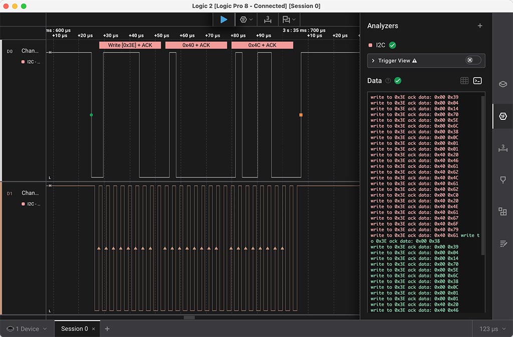 And I clicked start capturing button on app, and turned on the microcontrolled, so that we can capture I2C communication.