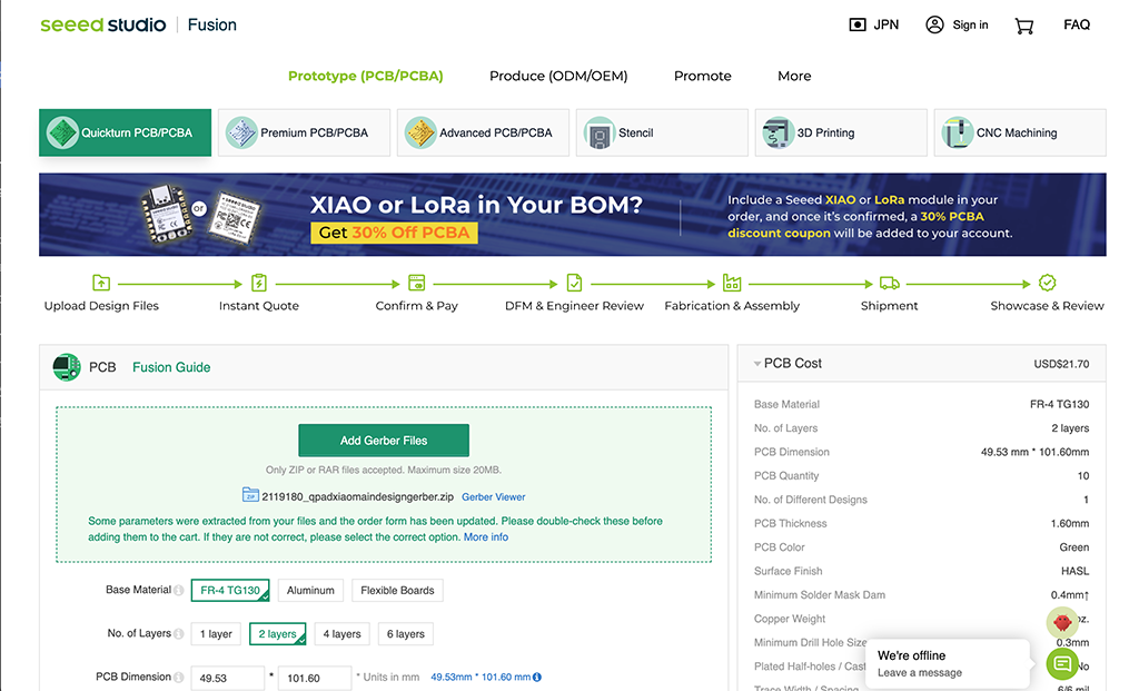 And accessed to Fusion PCB web page. Just need to click “Add Gerber Files” button and choose the zip file just downloaded.