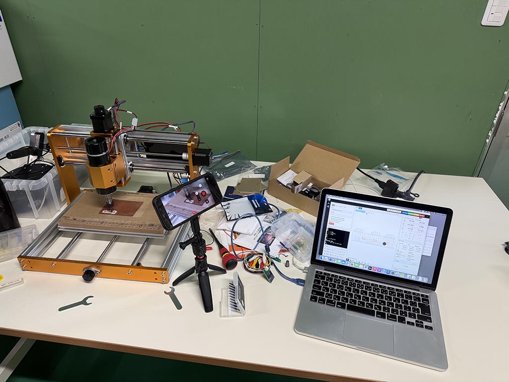 The controller on LUNYEE 3018 PRO MAX has Z-probing function but we used CNCjs as an interface so we couldn’t use Z-probing. If we use Candle, there are auto leveling function that probes and absorbs the slope of the sat board.