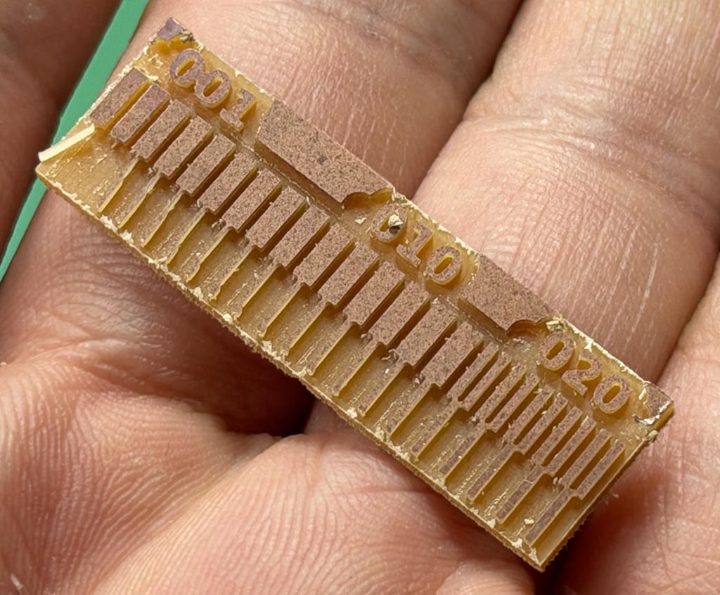 The bottom part should be test for trace. It looks 0.001-0.002 inch width traces were broken and 0.003-0.005 inch width are risky. I may set minimum trace width as 0.010inch ( 10mil, 0.254mm ). Top (or center) part looks tester for clearance. It look we need to have at least 0.020inch ( 20mil, 0.508mm ) as clearance.