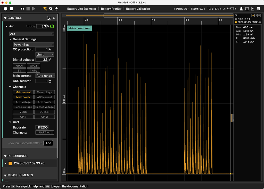 Yoshi have a power analyzer Qoitech Otii Arc. This tool can supply power and measure voltage and current. So we measured power consumption of SG90 clone servo motor with this measurement tool.