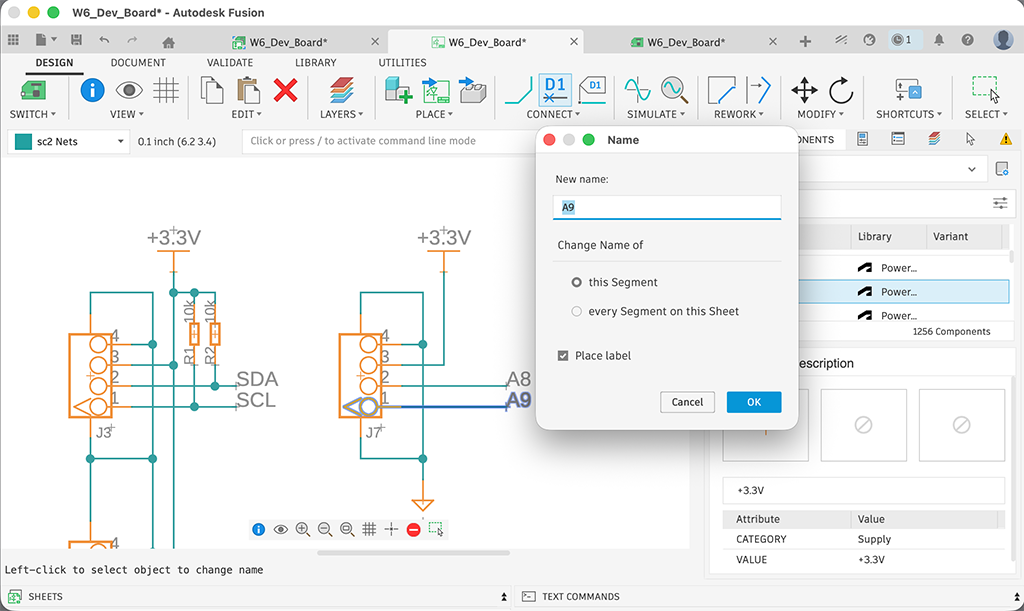 For the readability of schematic, I love to name connections. To name, right click the connecting wire and choose Name from menu. The name is the name of signal. In this case, it was connected to XIAO’s A9 pin, I named it as A9. By checking Place label, we can add a label. Otherwise there are nothing to see the signal name of each wires.
