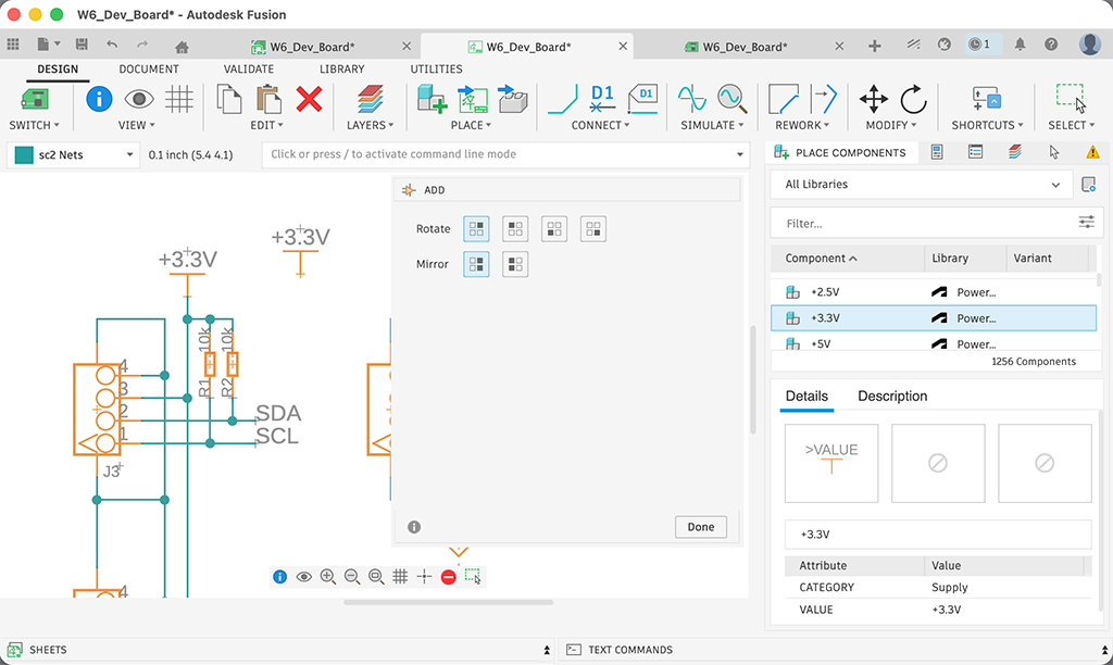 Once we have all component library on Fusion, I placed components on schematic by using PLACE button. To connect components with wires, uss CONNECT button.