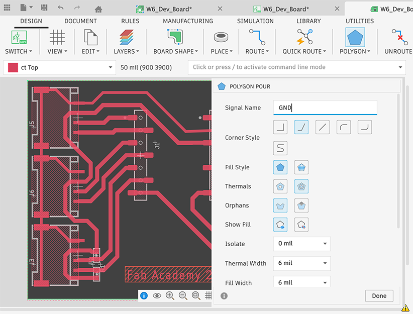 To draw a ground plane, we use POLYGON. I sat signal name as GND because it’s a signal name of power symbol. And then, draw a polygon to enclose the board shape. I think we’d better to set large value like 50 mil for Isolate for milled PCB.