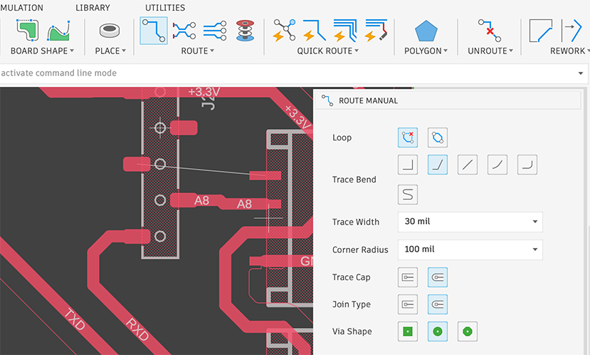 To connect wires on layout, I click ROUTE button and sat trace width as 30 mil because through it’s much bigger than 20 mil I mentioned above. Then, click a end of yellow thin wire and tried to draw a wire by moving mouse pointer. When we reach drawing wire to the other yellow wire end, one wire routing would be finished. We need to connect every yellow narrow wires, because it reflects connections on the schematic.