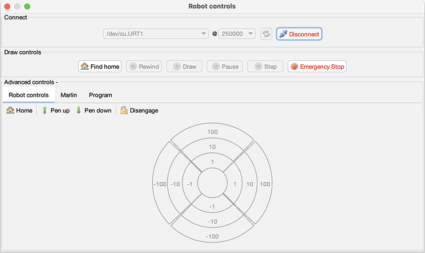 On the robot controls window, we can move pen as same as XYZ machines and send g-code to machine.