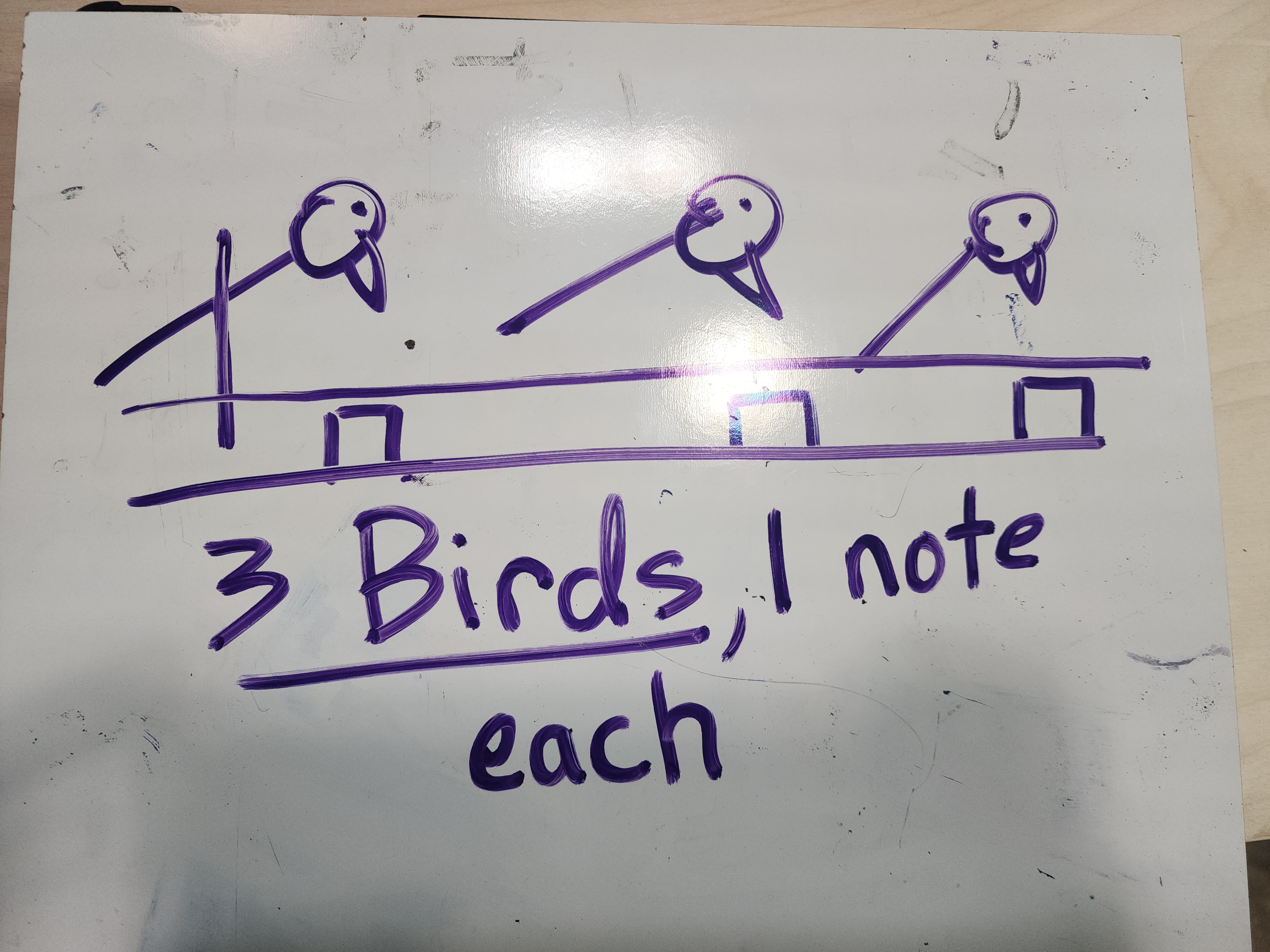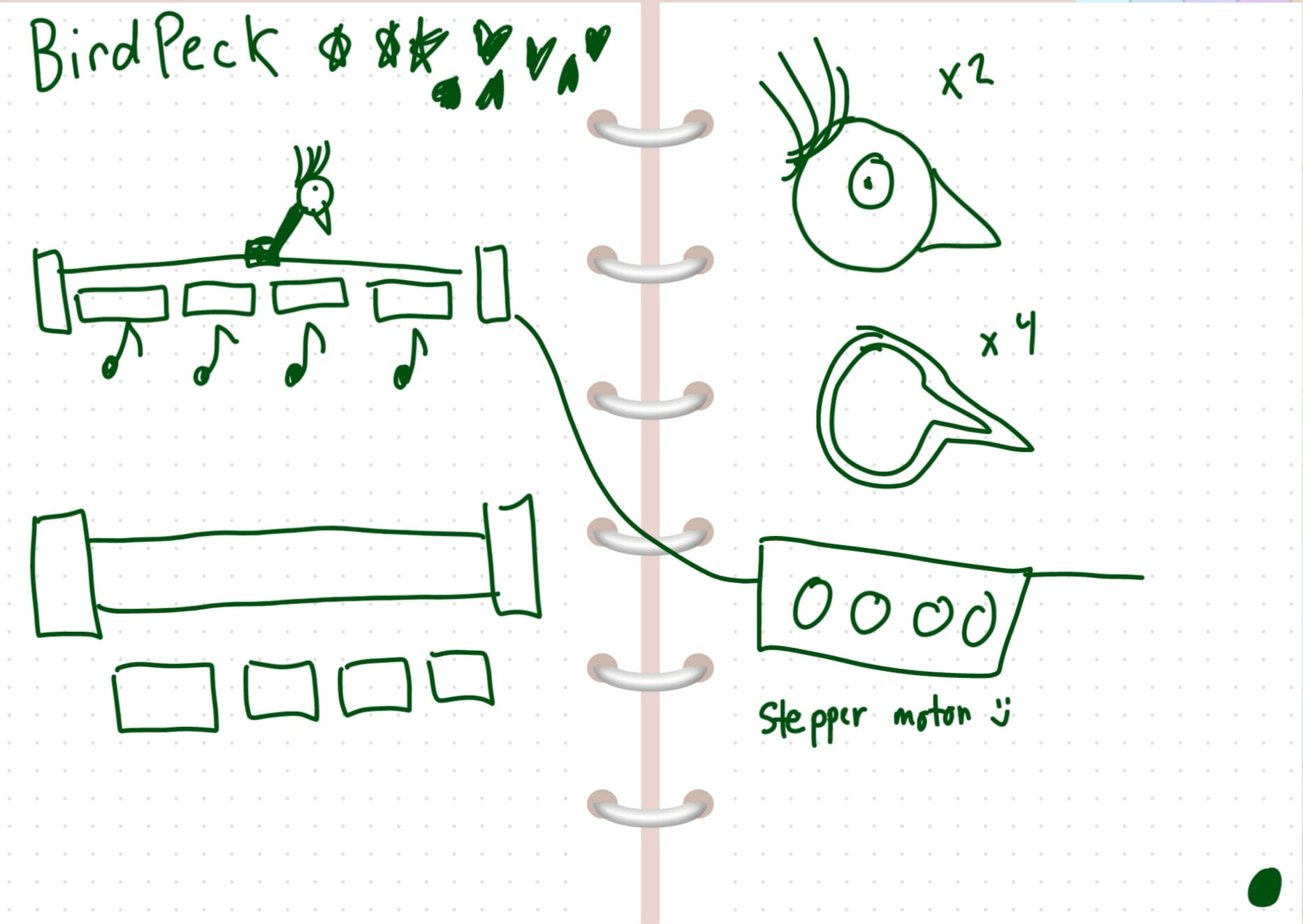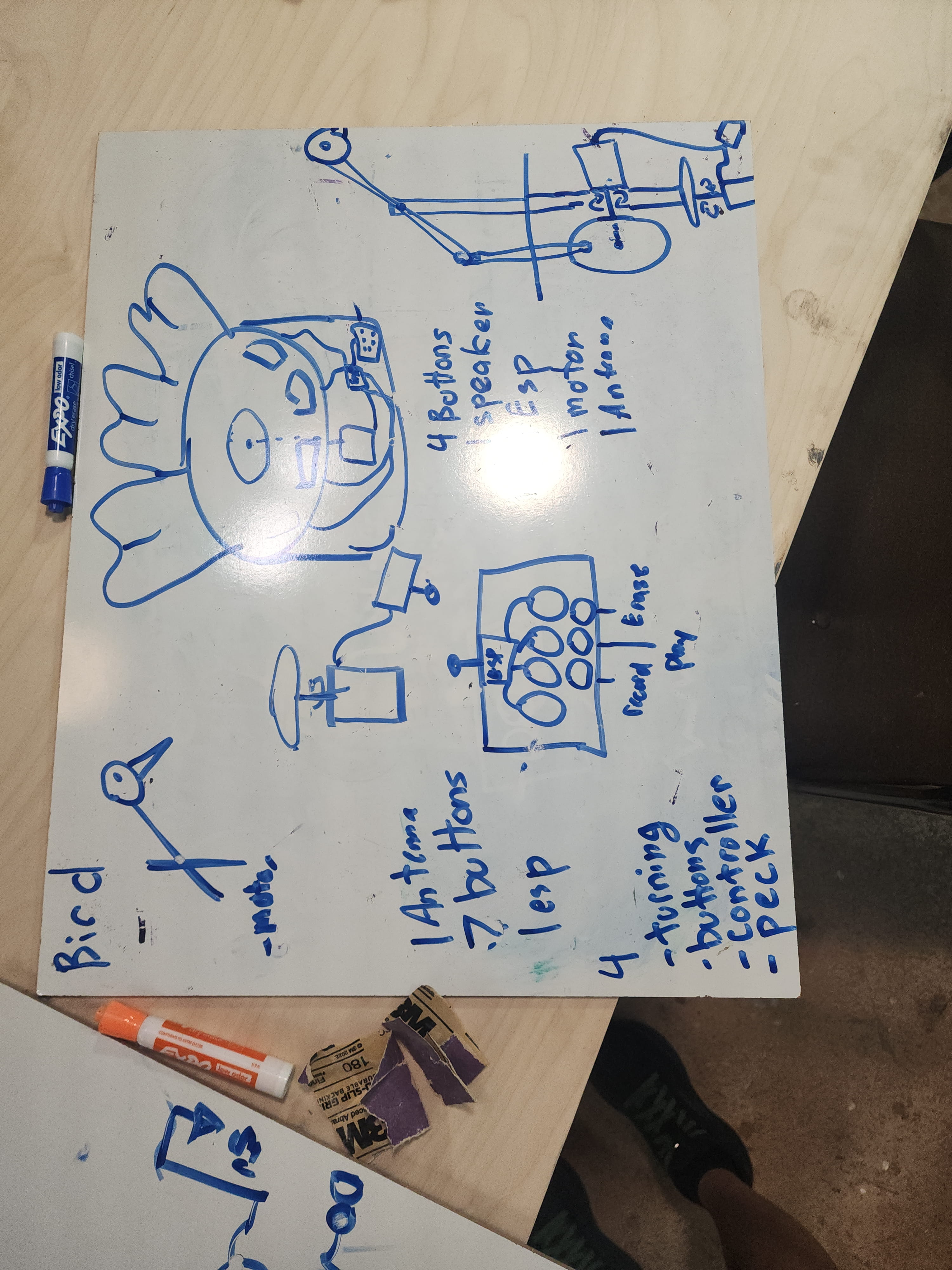 First I sit down with my classmate Angela to make a plan. We want to make a machine called “BirdPeck”. It is made of little hammers that look like birds pecking a button to make a sound! We originally thought of having 1 head move around, but simplified it to having multiple heads; we are making a Birdband! We will also build a controller, where each button represents 1 note/bird.
