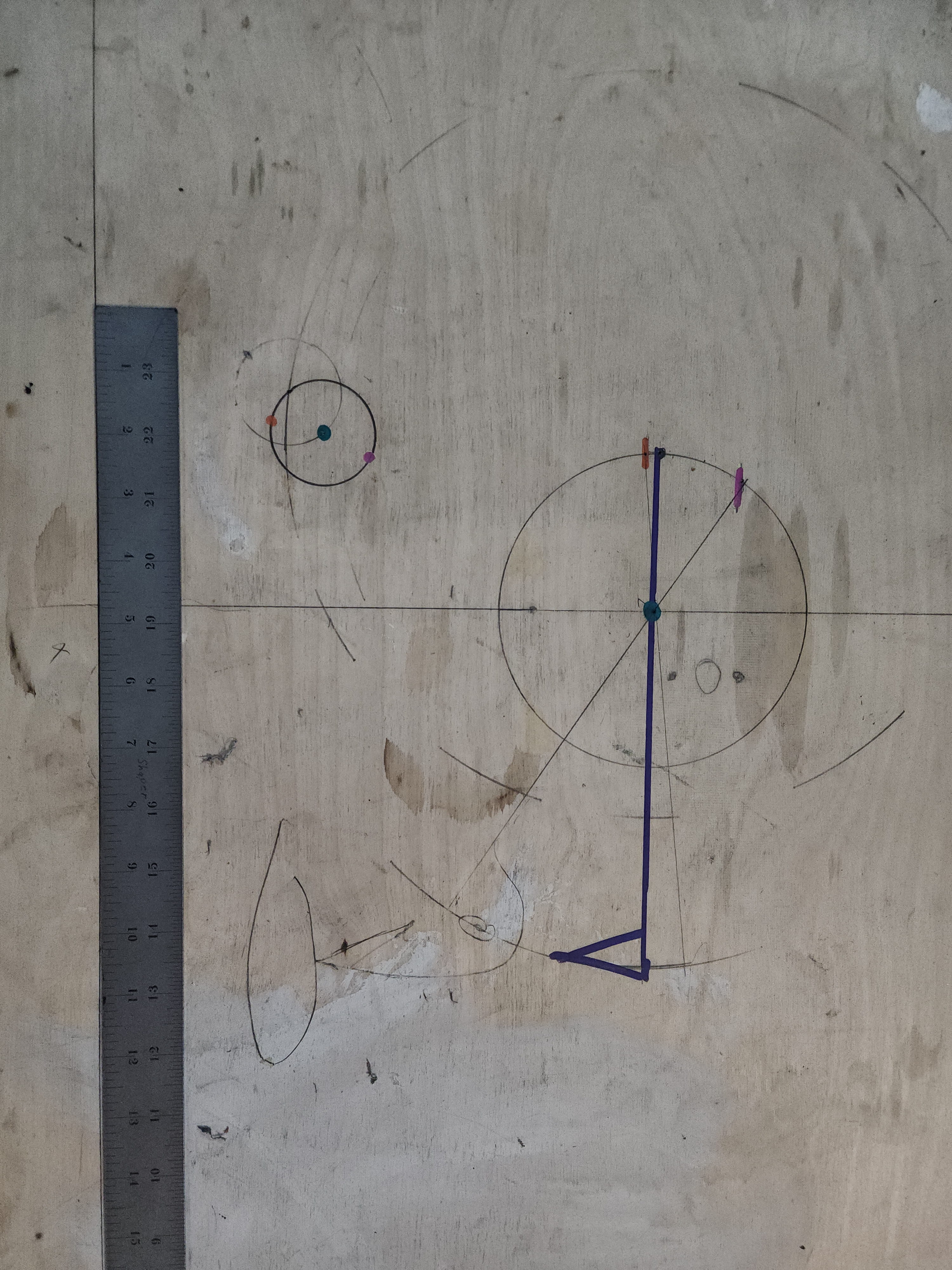 The instructor say with me and drew rough measurement’s of what I had made. This is a rough kinematics chart! The green dots are the fixed points, the pink dot and pink line represent the highest lowest motion the birds head can be, and the orange dot and line represent the highest motion.