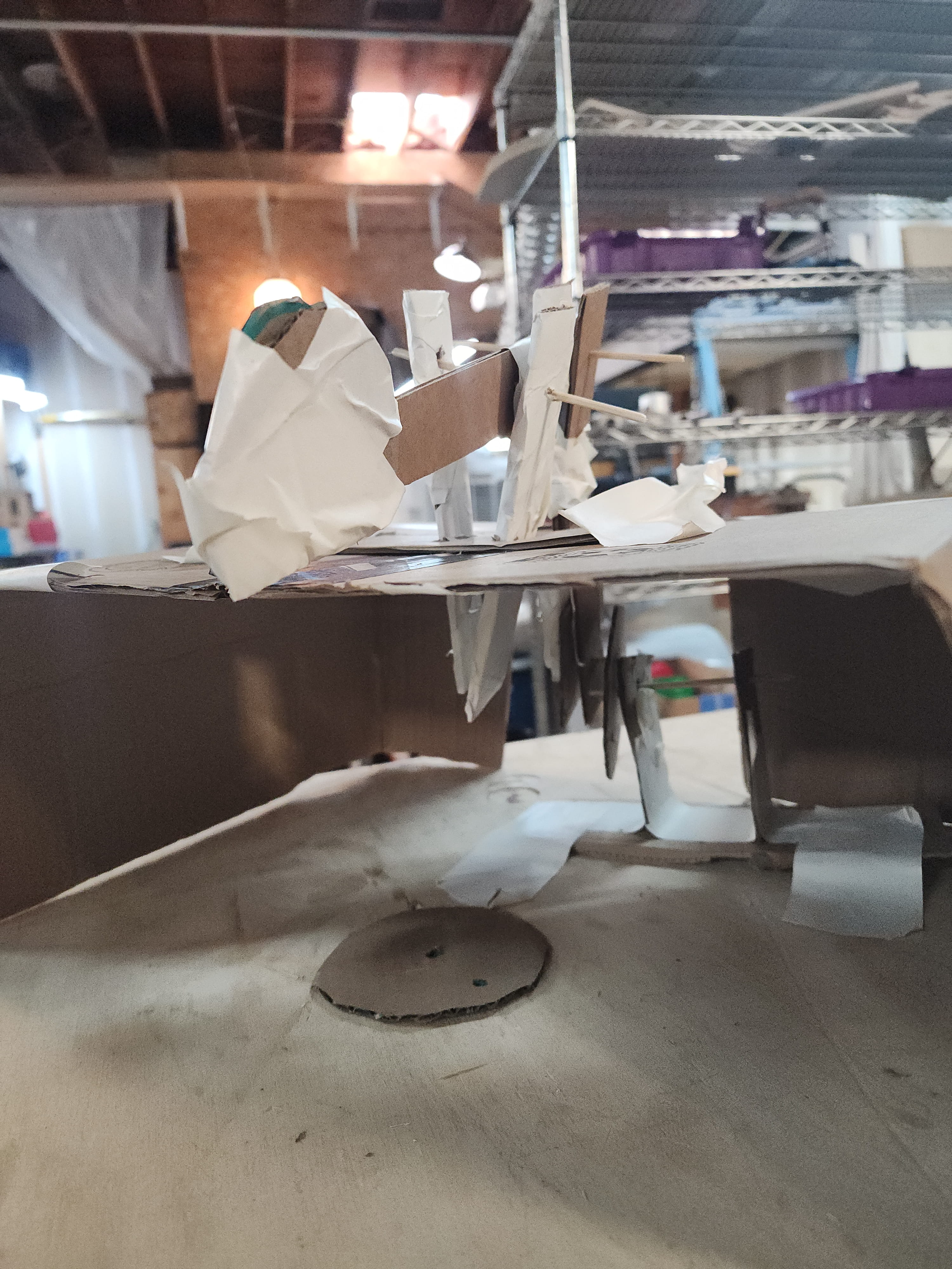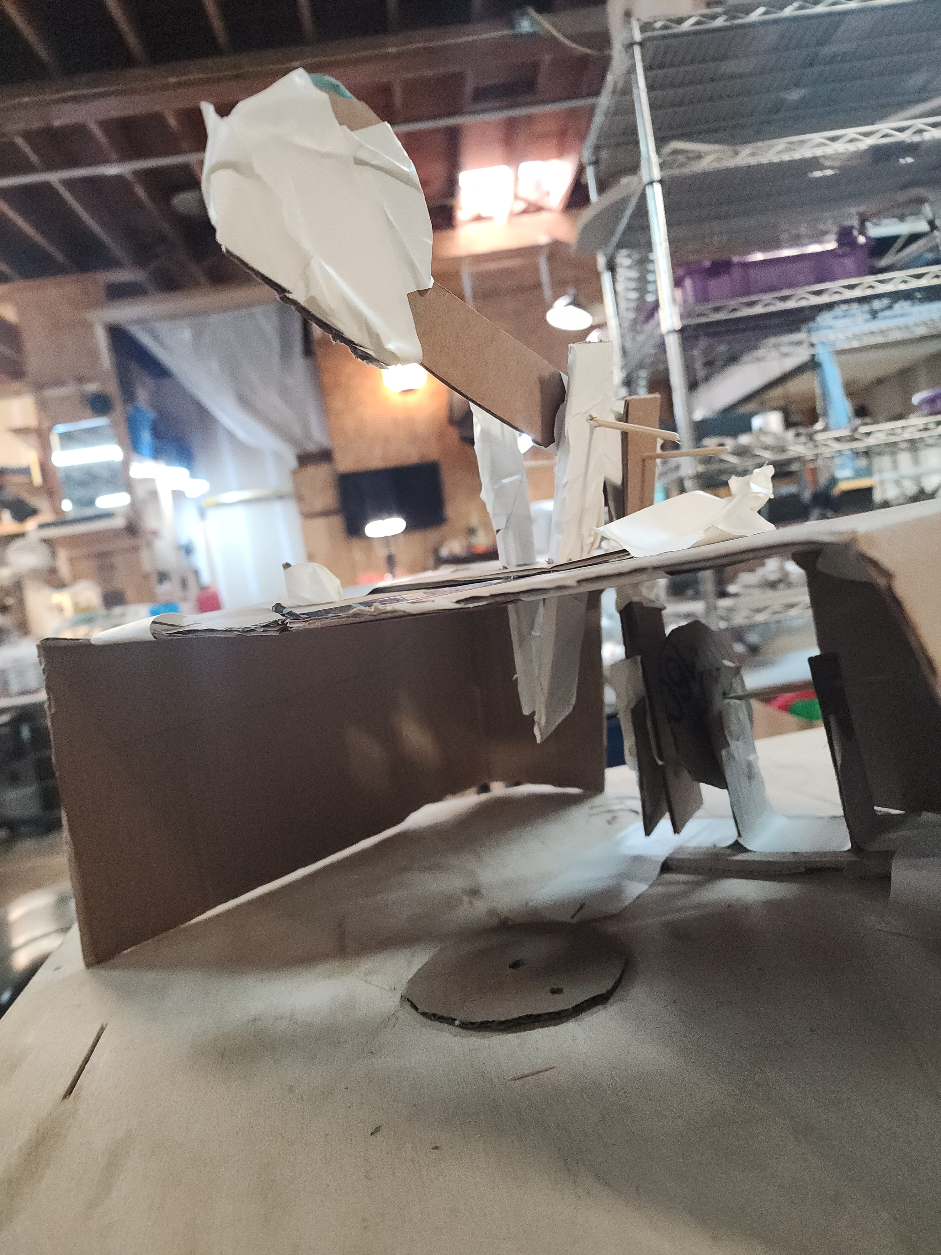 After a few hours I was able to make a mostly successful cardboard prototype of the striking motion. It is made from 4 pivot points and 2 linkagaes, including a cam to move the head up and down.