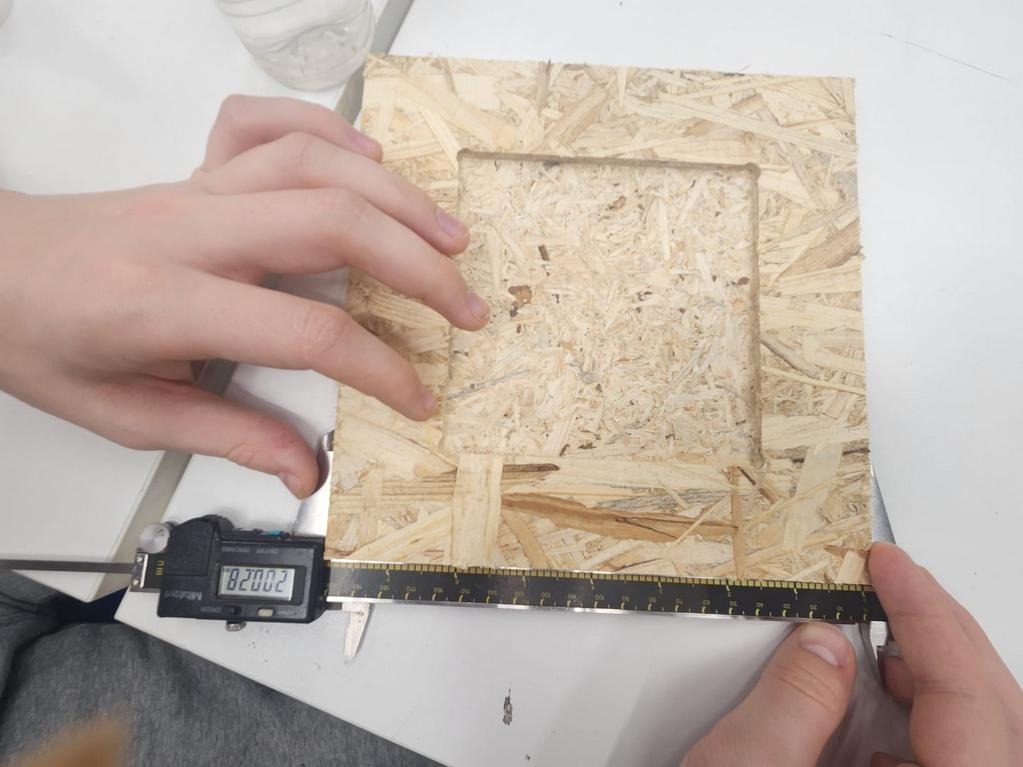 Using Fusion 360, we designed a model that includes a rectangle with dimensions of 200 mm × 200 mm. The rectangle was extruded to a height of 11 mm, which corresponds to the thickness of the material we planned to use. Inside this main rectangle, we created another rectangle in the center with dimensions of 120 mm × 120 mm on the XY plane. This inner rectangle was extruded -5 mm to create a pocket feature, which allows us to test the pocketing operation of the CNC machine.