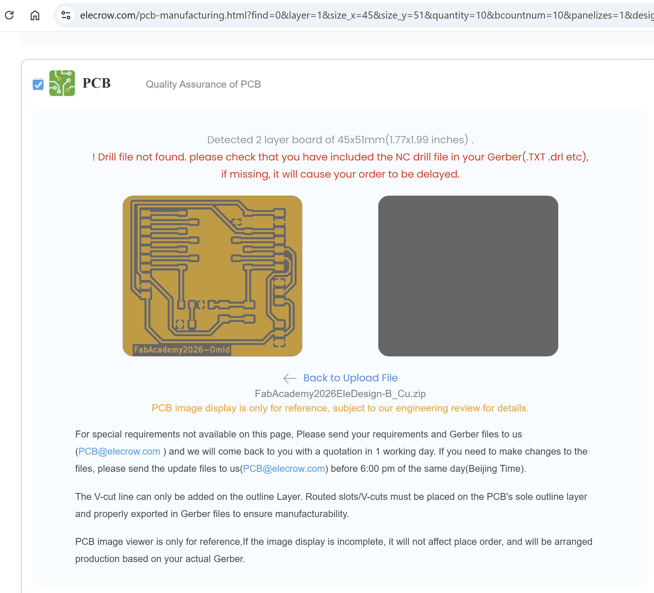After uploaded, the board number of layers, and dimension appeared. Our board did not have any drill, so there was an error message: