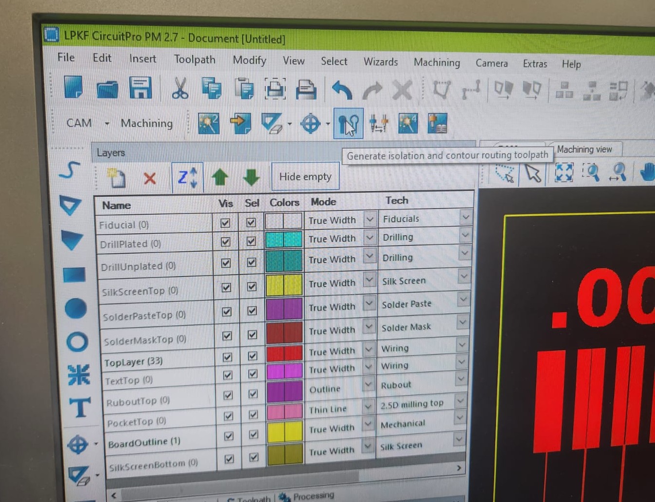 Next, was setting up for contour routing toolpath and generated isolation: