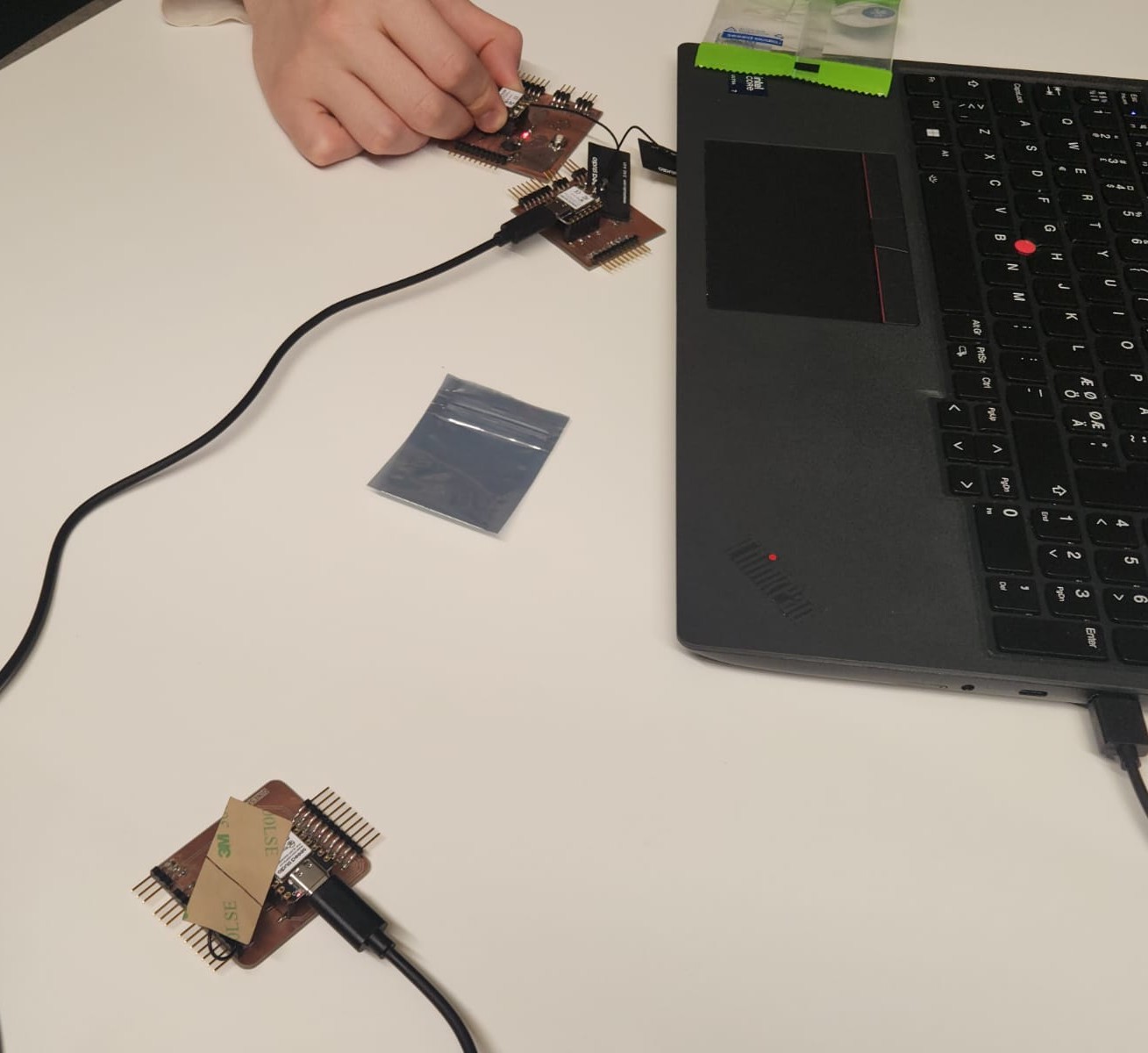 We used own boards which we made in Electronic production week, and ESP32-C3 microcontroller and its own antenna: