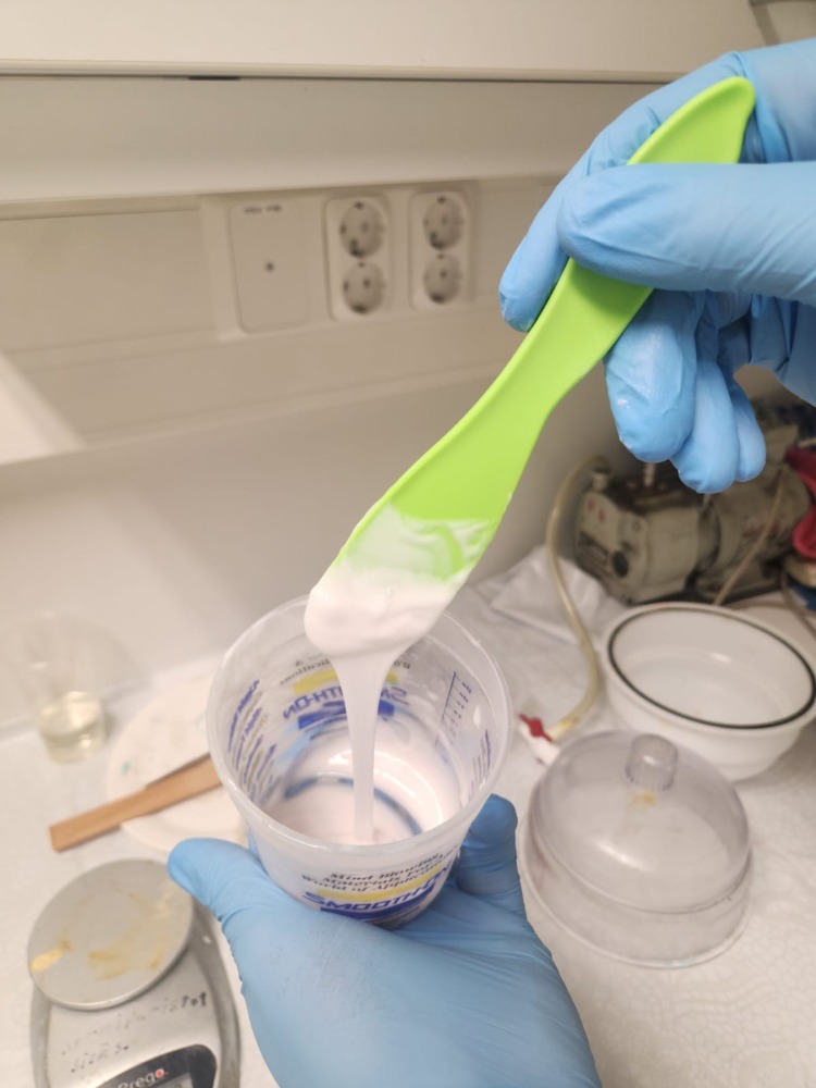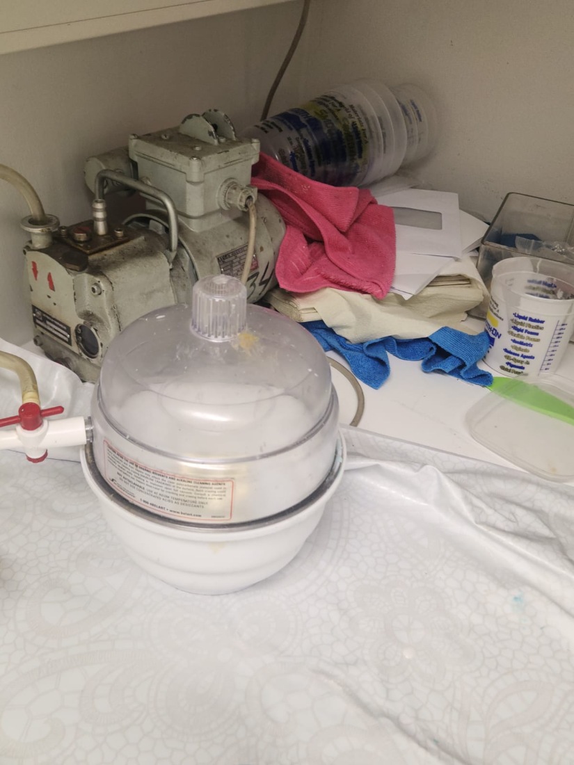 As mentioned, there were too many bubbles produced during mixing. To remove them, we used a vacuum machine for about 2 minutes.
