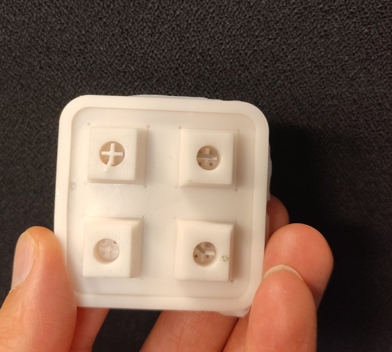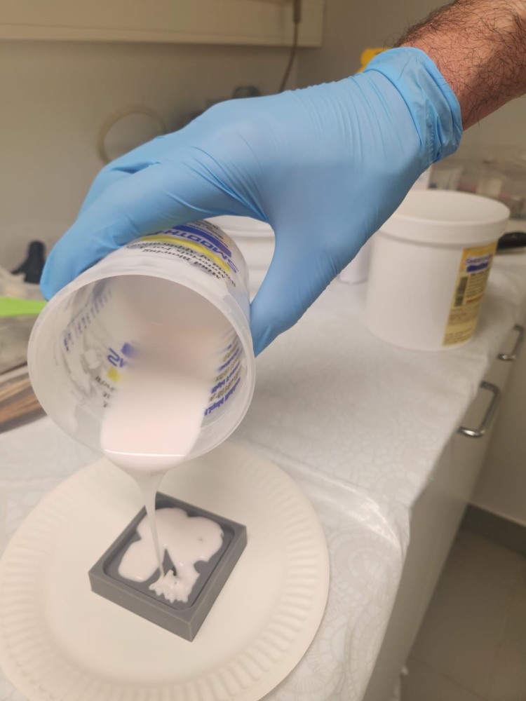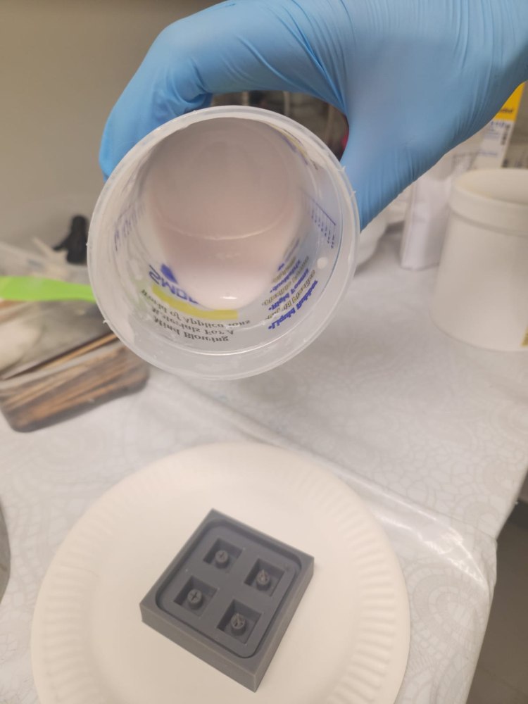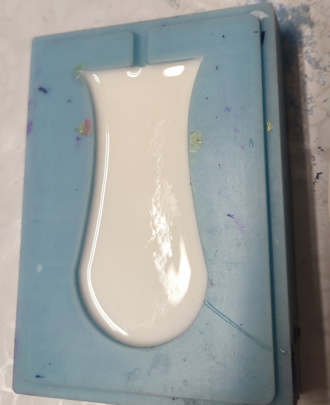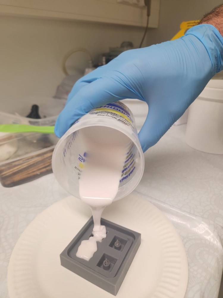 We left it to cure for more than 28 hours (the data sheet specifies 24 hours). We found that the surface shrank, which means the mold needs to be filled slightly above the surface to get the correct shape.