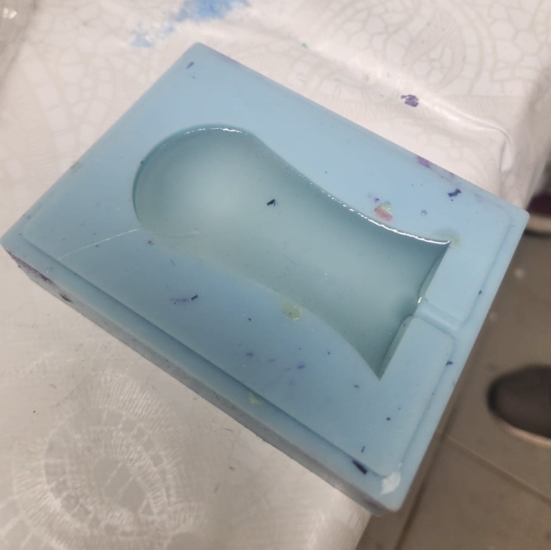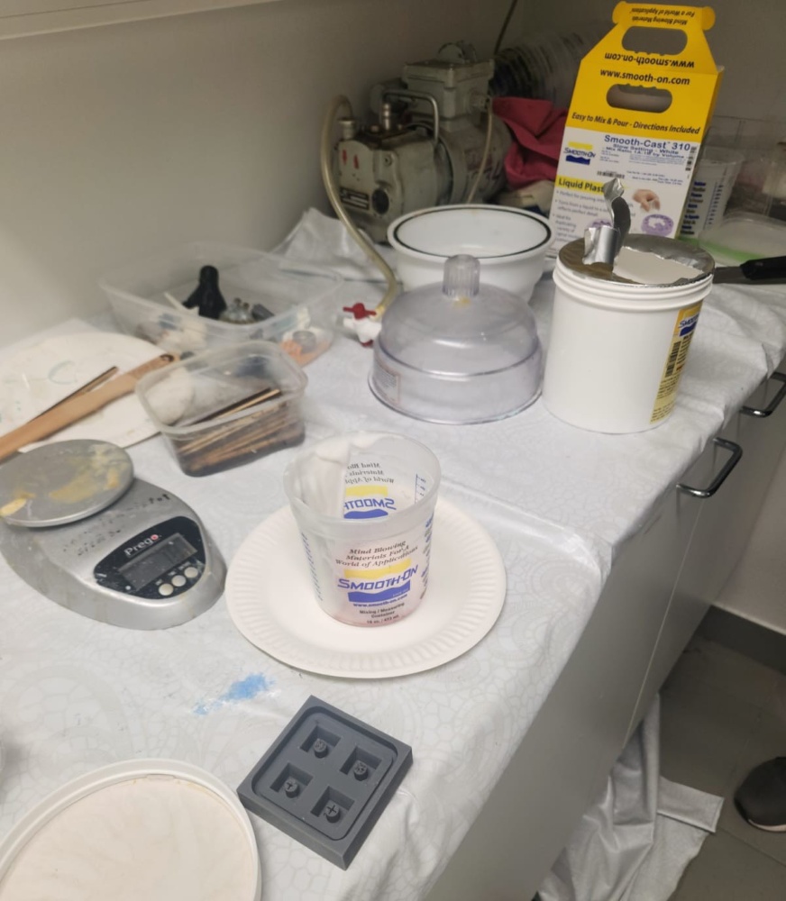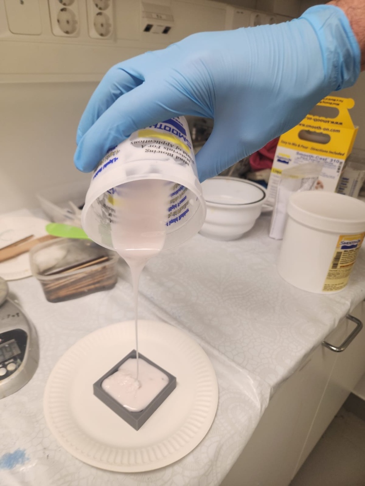 Degassing and pouring. Before poured it in the hard mold, we spread inside the mold to make the silicon easy to remove: