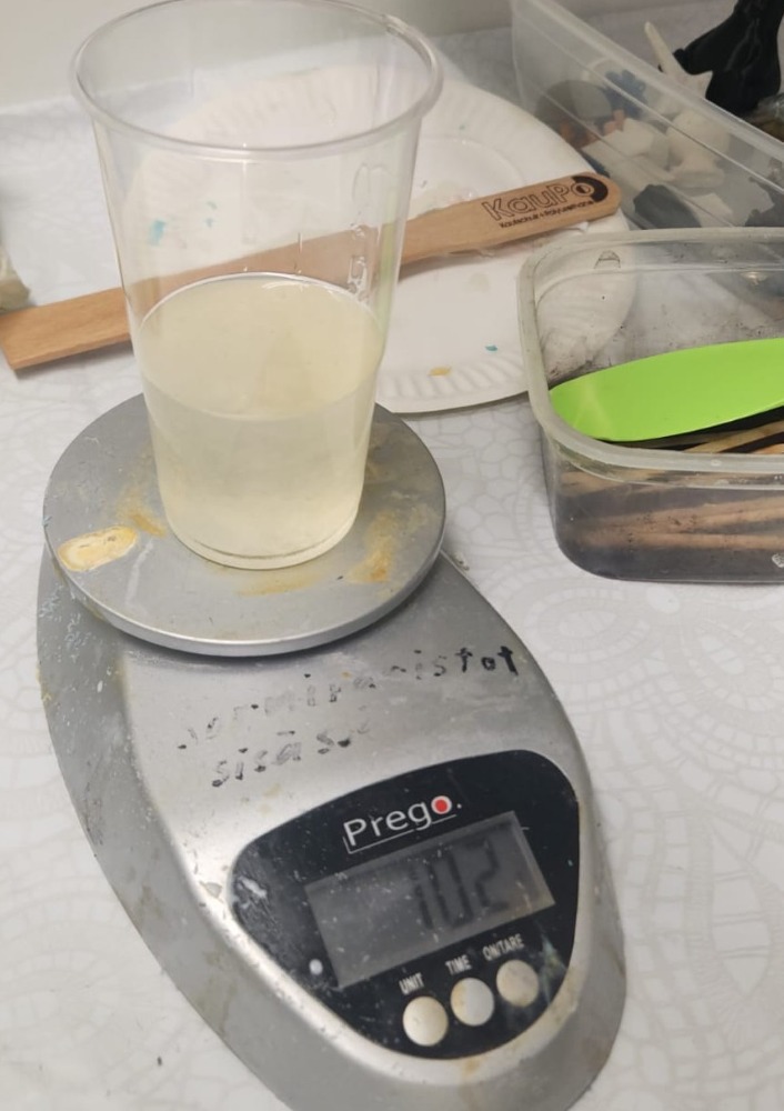 After measuring, we slowly started mixing manually. Since it was our first time, there were many bubbles in the mixture.