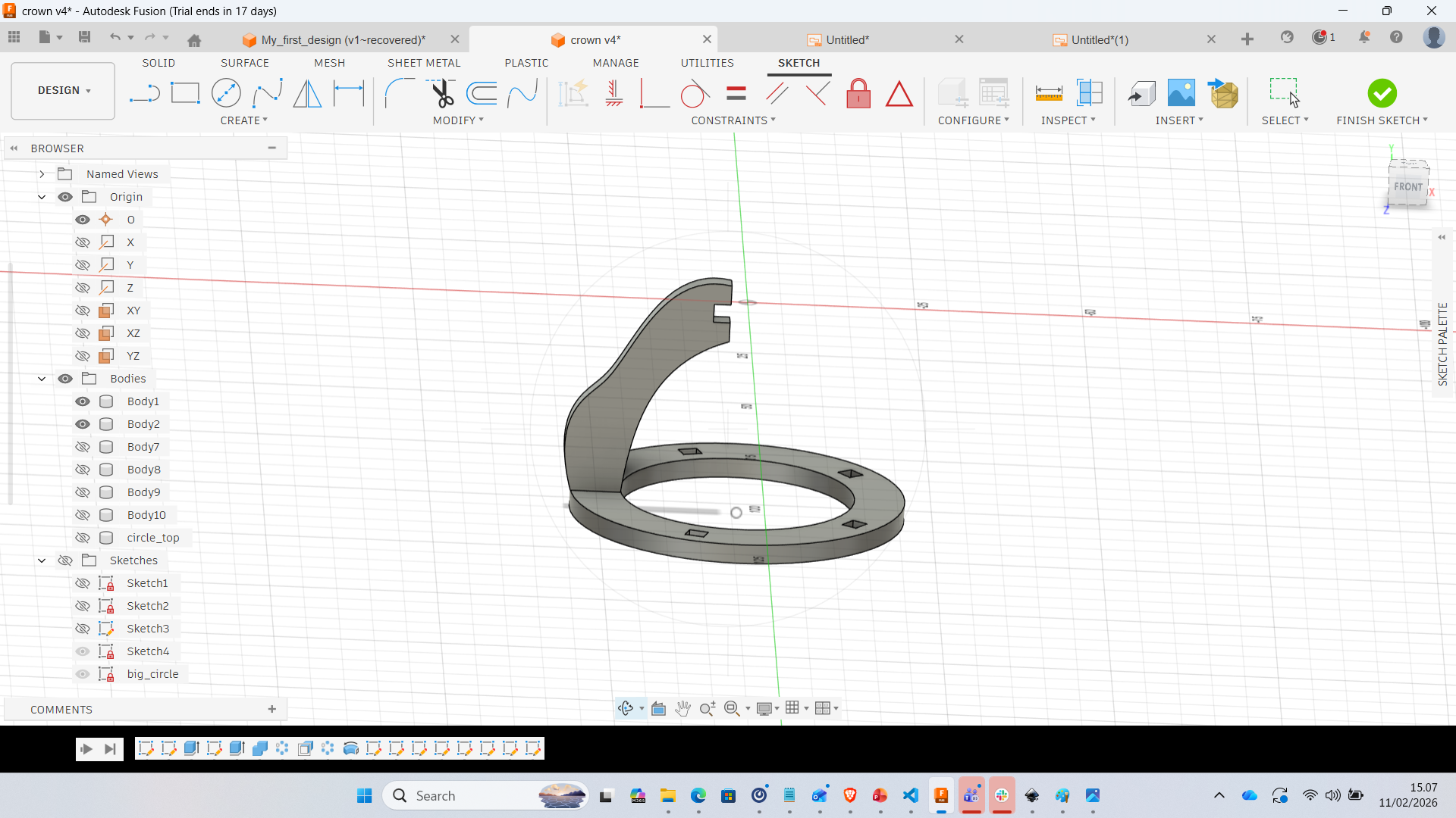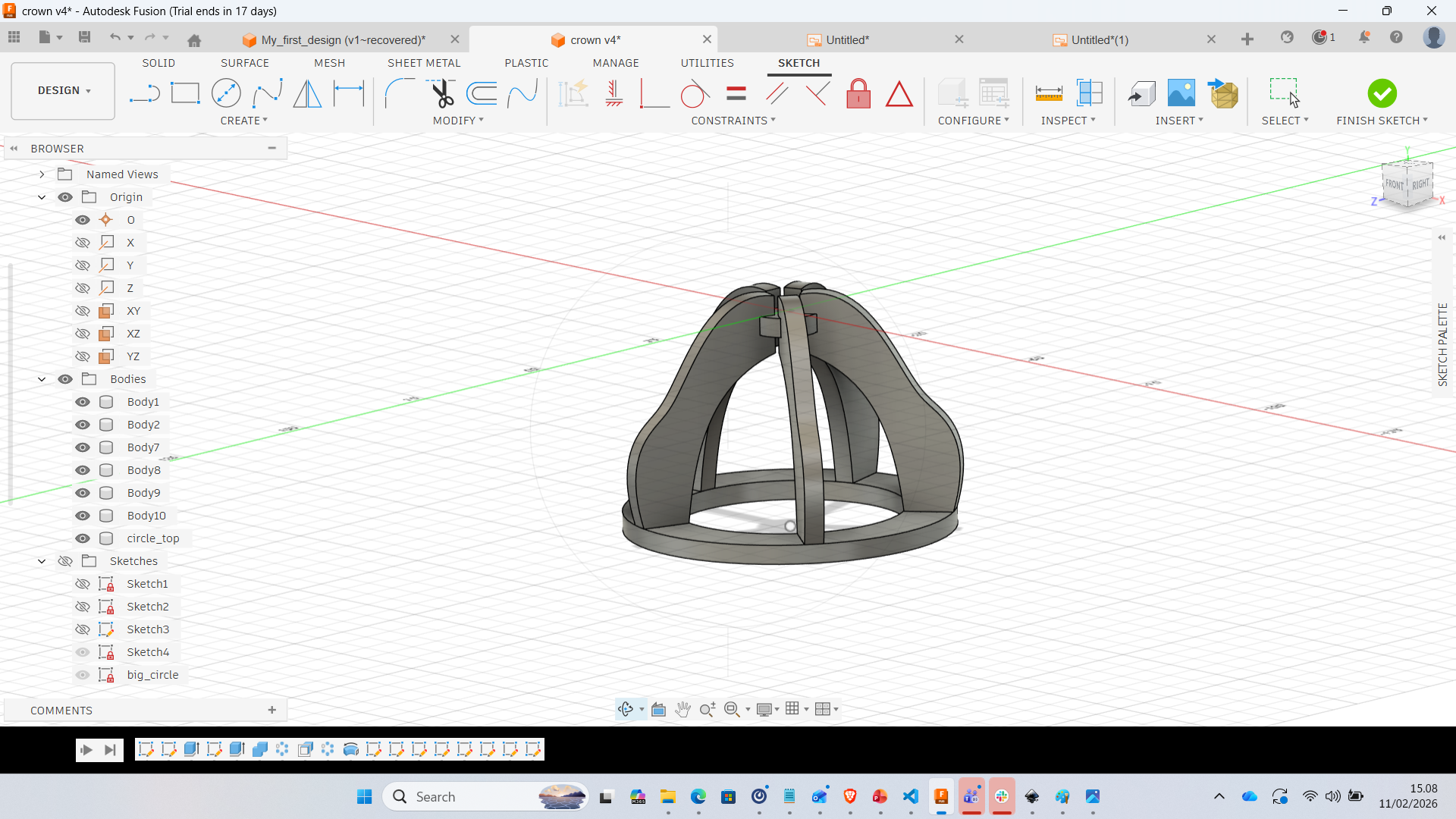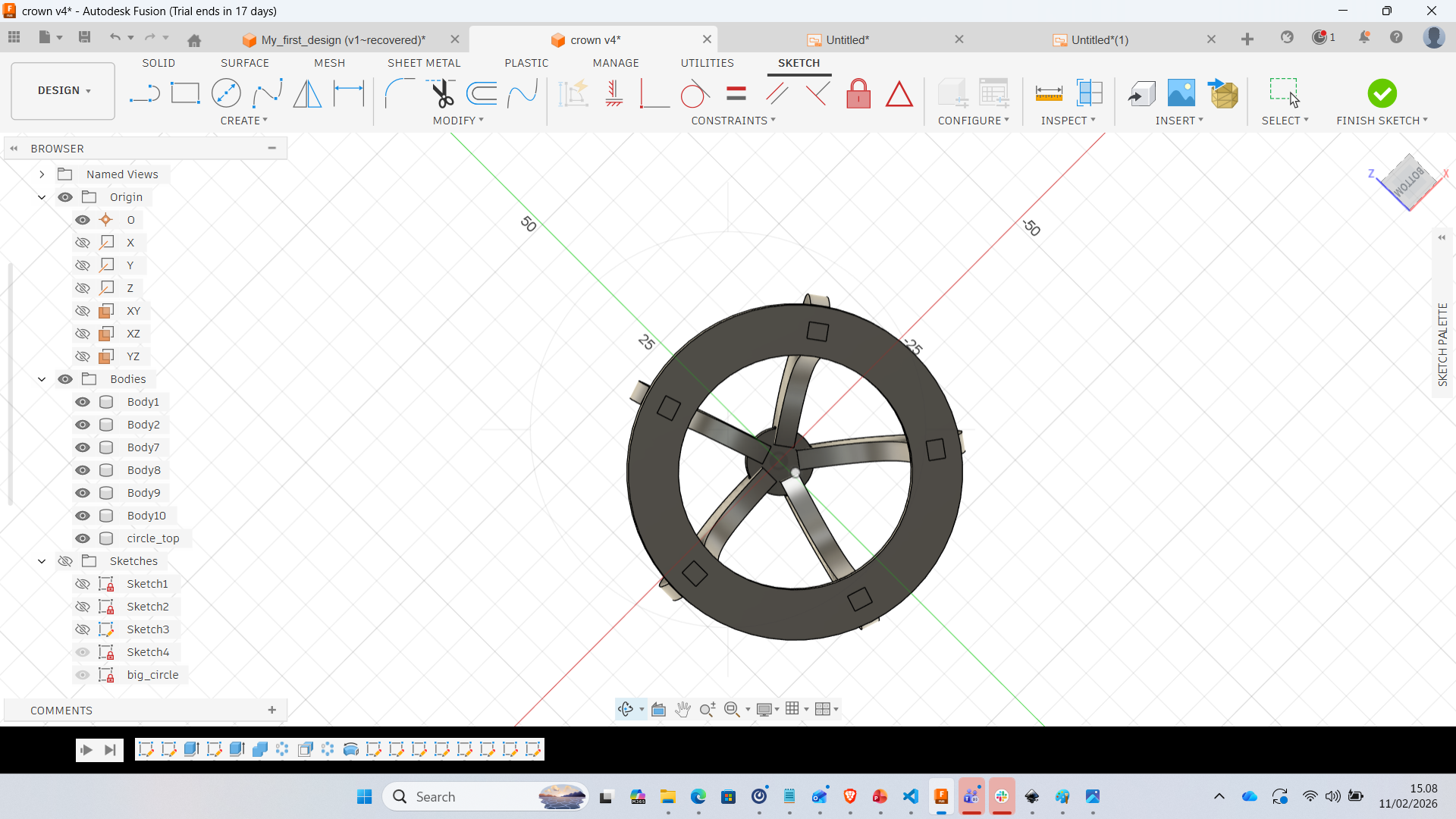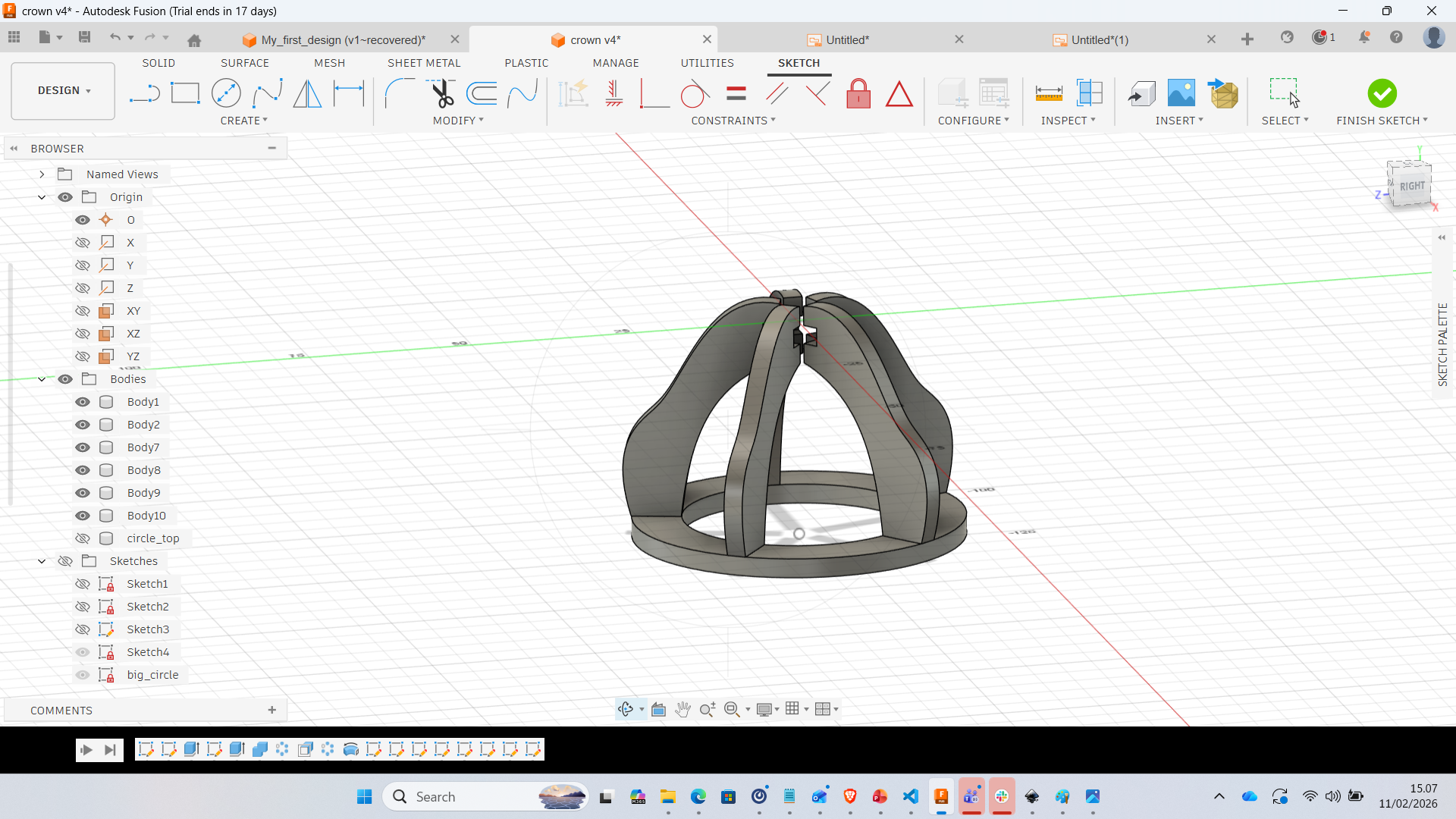 For this week's assignment, I decided to design a parametric crown structure inspired by laser-cut modular decorative models. The objective was not only to replicate a form but to understand how parametric constraints can control geometry.