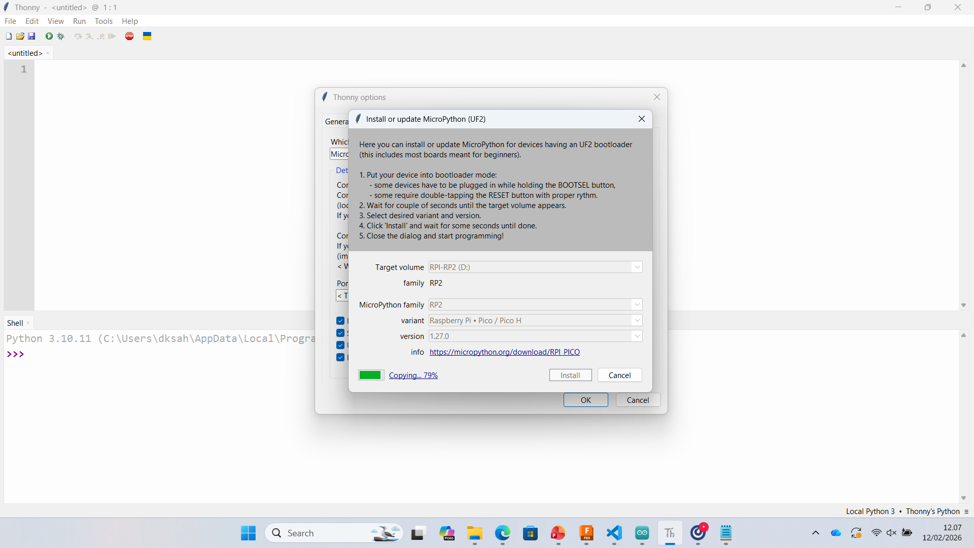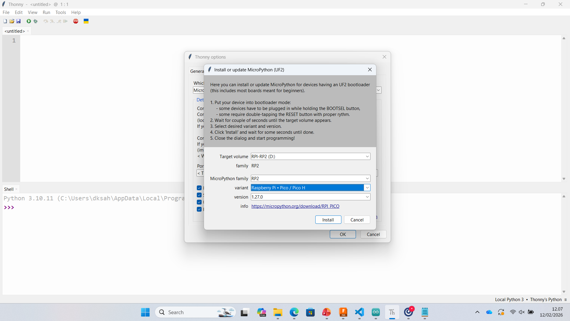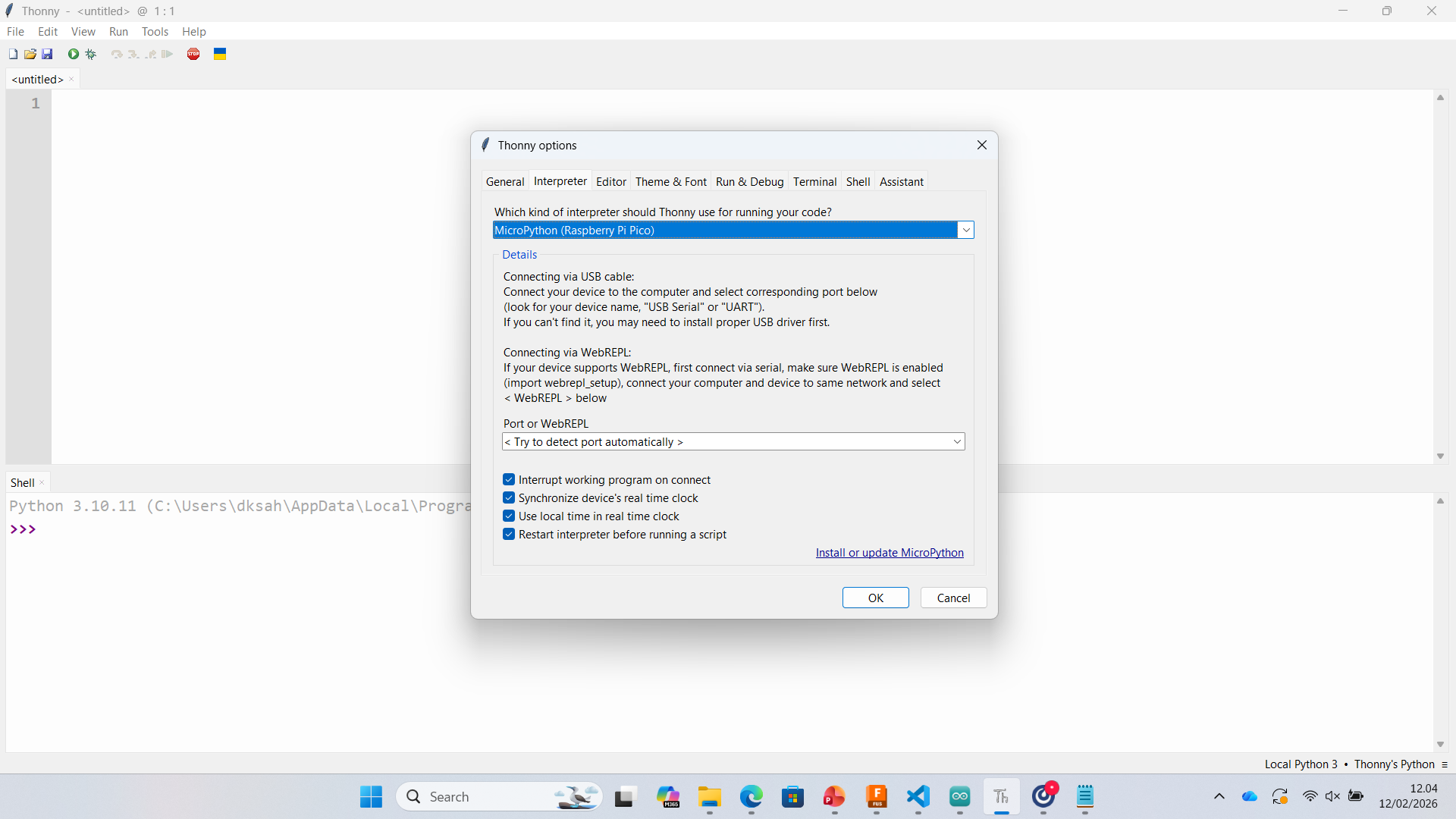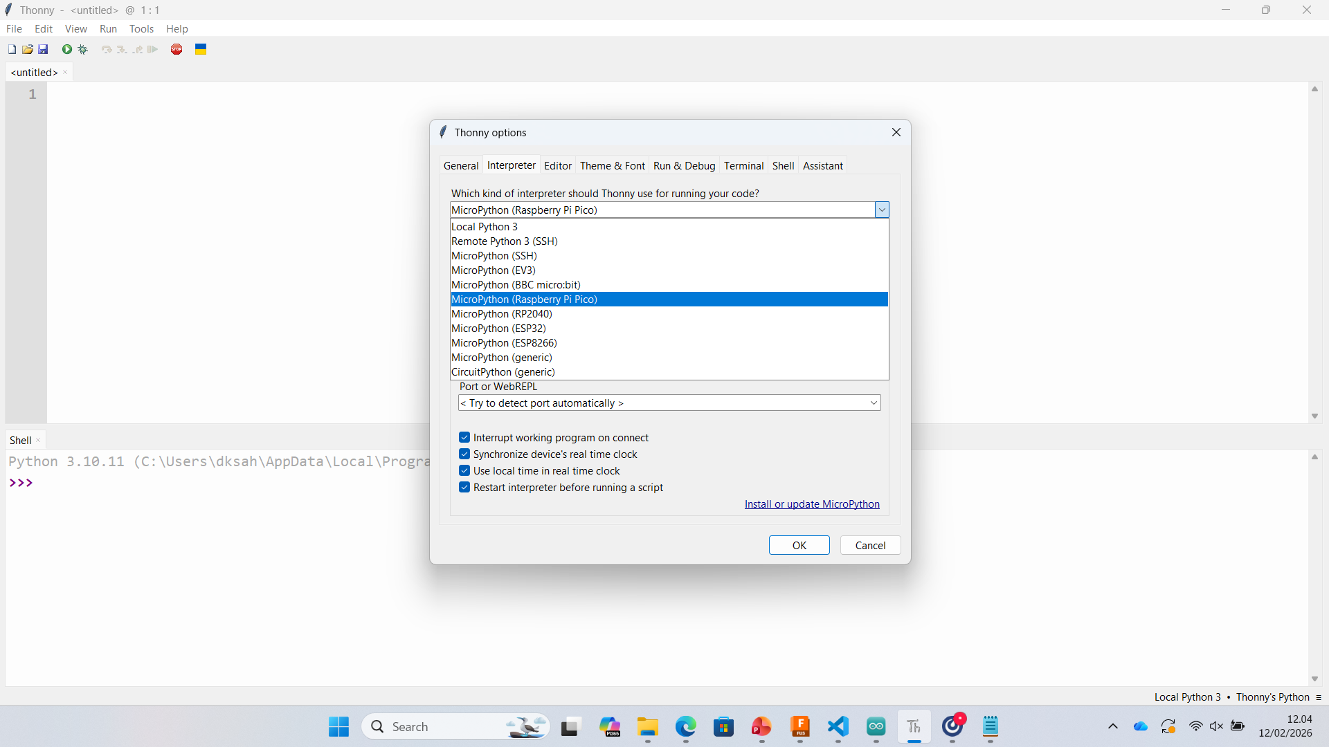 To begin, I installed MicroPython firmware on the Raspberry Pi Pico using Thonny’s built-in installer.