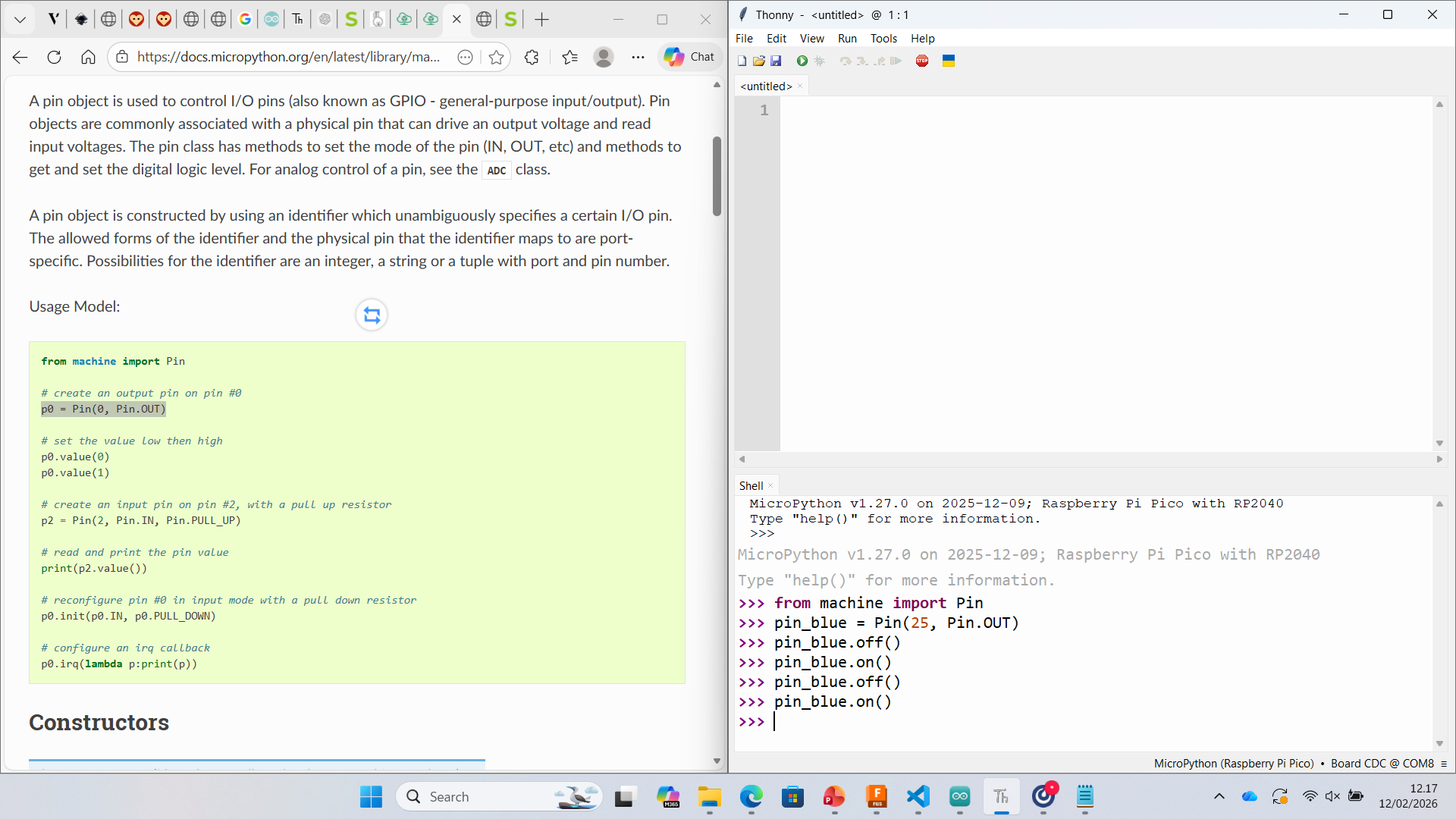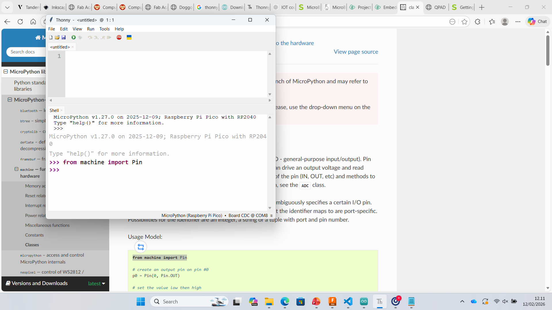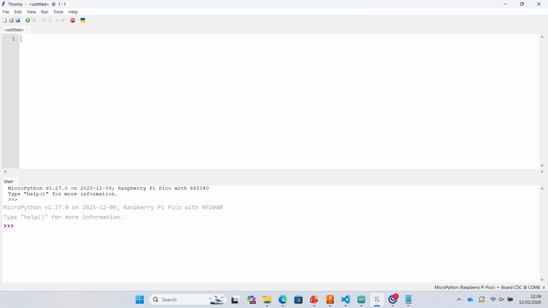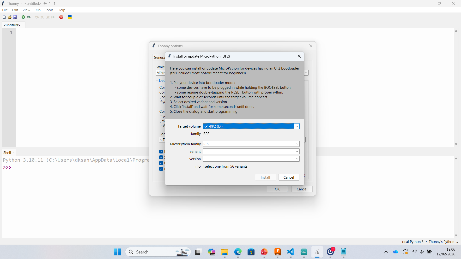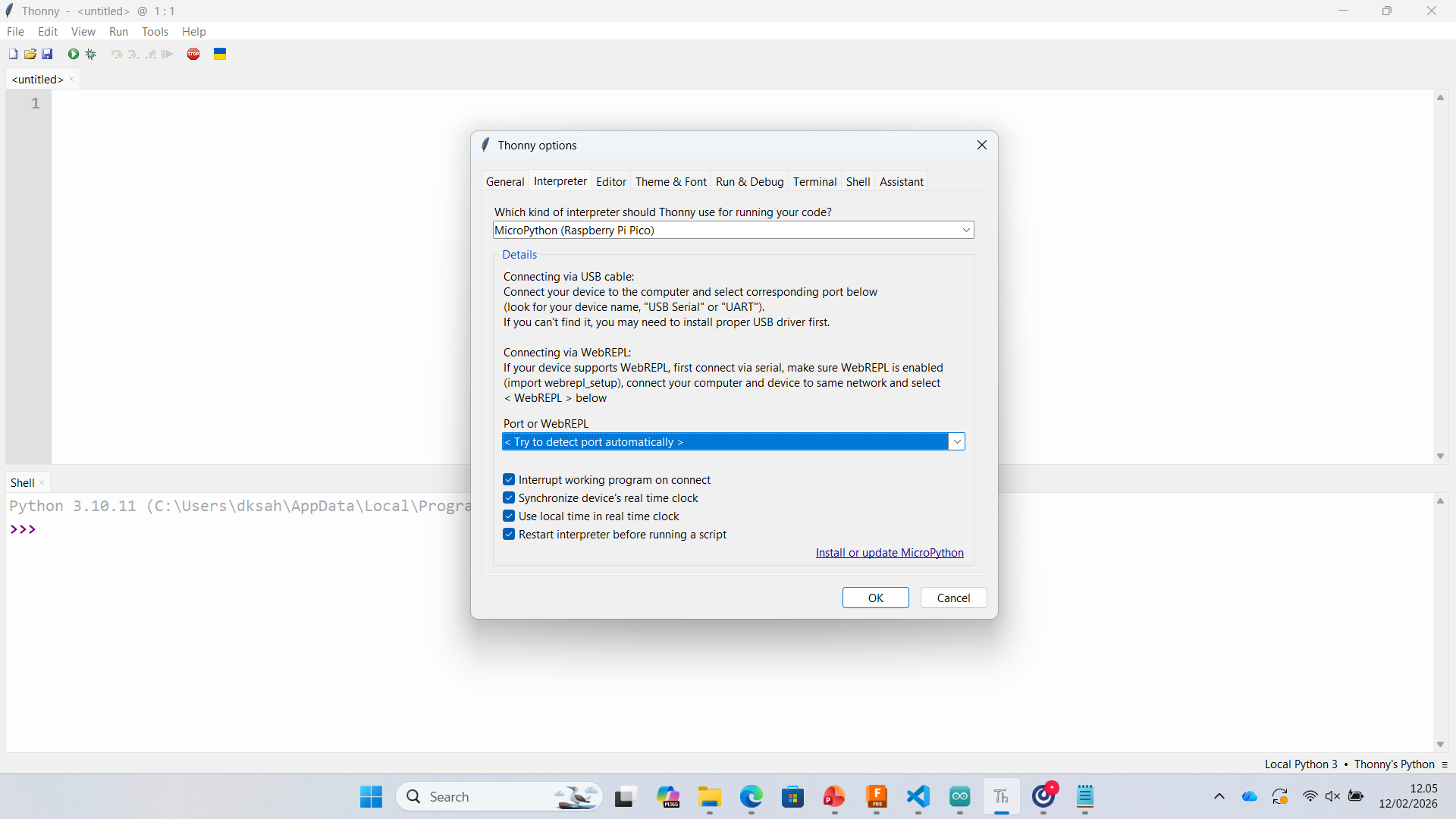 To begin, I installed MicroPython firmware on the Raspberry Pi Pico using Thonny’s built-in installer.