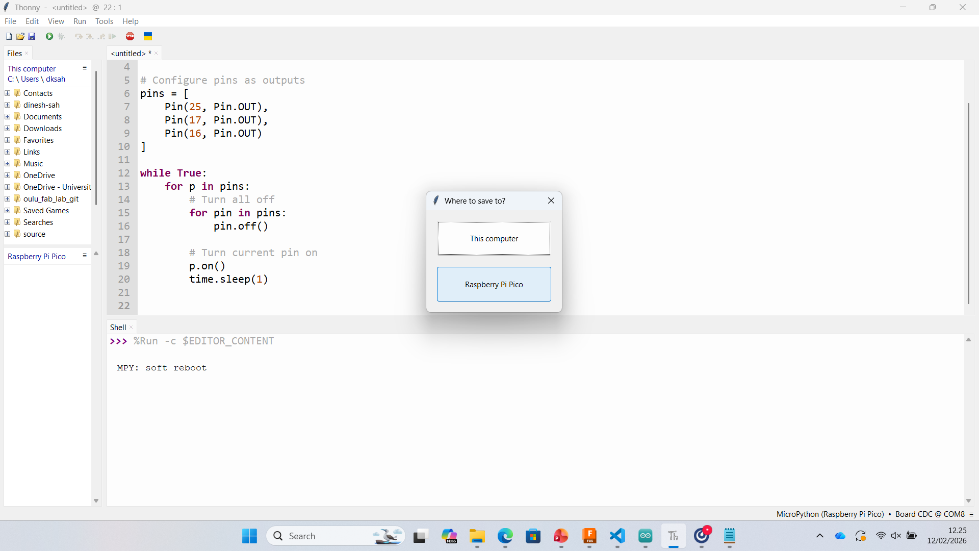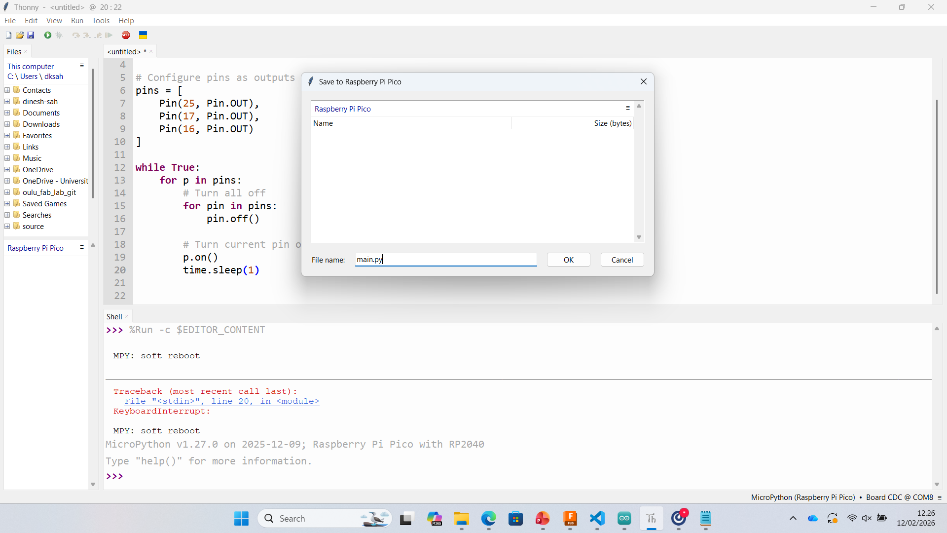 To make the program run automatically after reset, I saved the script as main.py directly on the Raspberry Pi Pico.